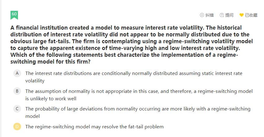 同学你好,A选项错在应该是非条件正态分布(假定是静态波动率的情况);B错在在题干案例中正态分布的假设不合适,因此采用机制转换模型才是更加合理的选择,机制转换模型会表现的更好;C错在在使用机制转换模型时由于其能够反映收益率预测中的条件信息影响,所以会降低偏离正常的概率(而不是增加)。