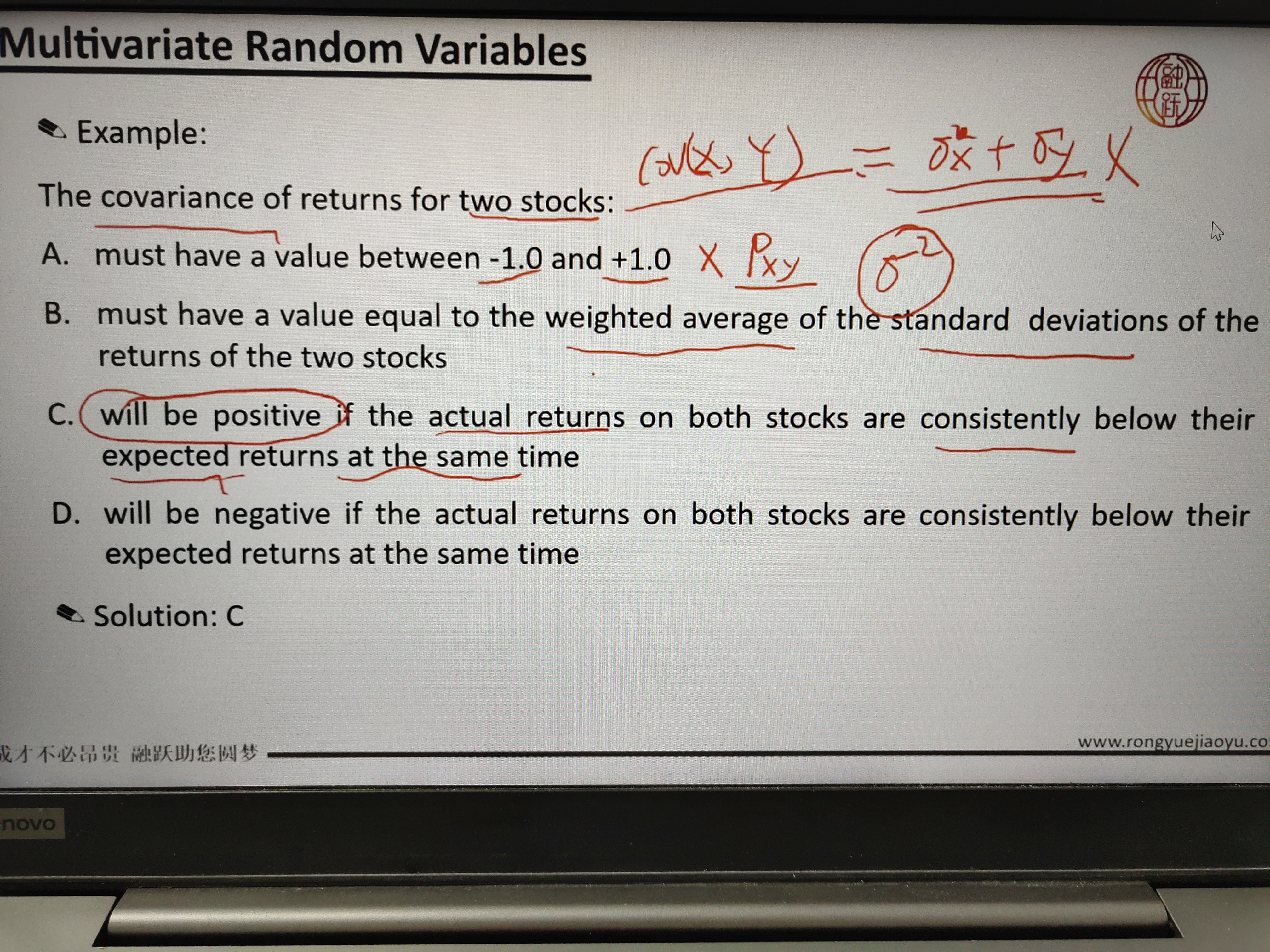 同学你好,这道题C选项的意思是说两个股票同时都是低于预期收益,你可以理解为两个股票都跌了,说明两个股票的走势是一样的,说明他们的协方差为正数。