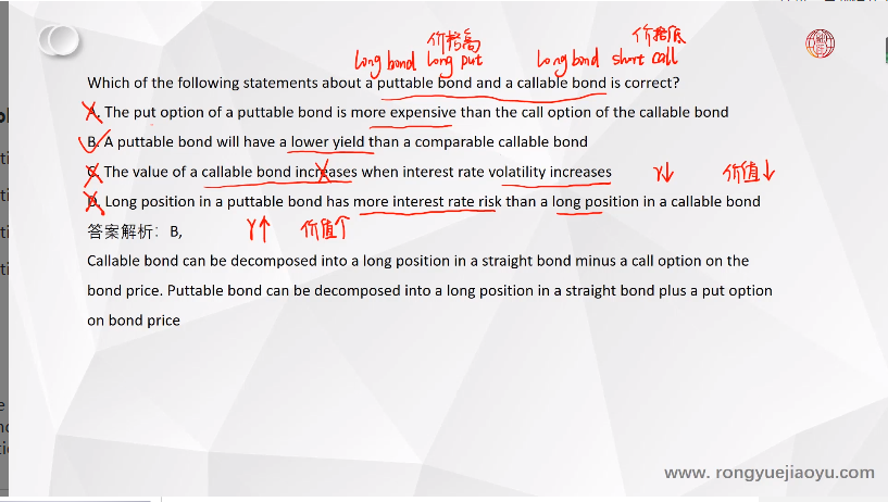 同学,C选项意思是说当利率波动性增加时,可赎回债券的价值是增加的,是错误的哈,因为当利率下降的时候,可赎回债券由于负凸性的出现价值是下降的;D选项也是错误的,因为可回售债券在利率上升时有将债券回售给发行方的权利,所以利率风险比可赎回债券小