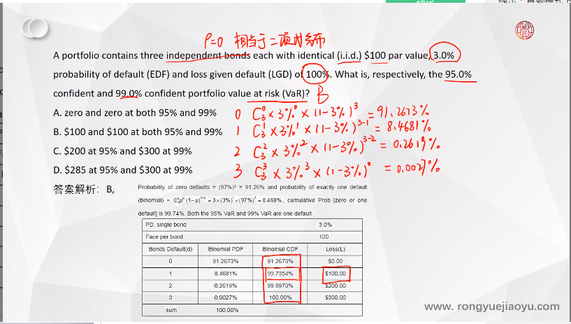 同学,根据0个损失和1个损失出现所计算出的概率,91.2673%和8.4681%,累计概率为99.7354%,大于99%和95%,所以VAR的取值就是100哈,可以参考图片理解