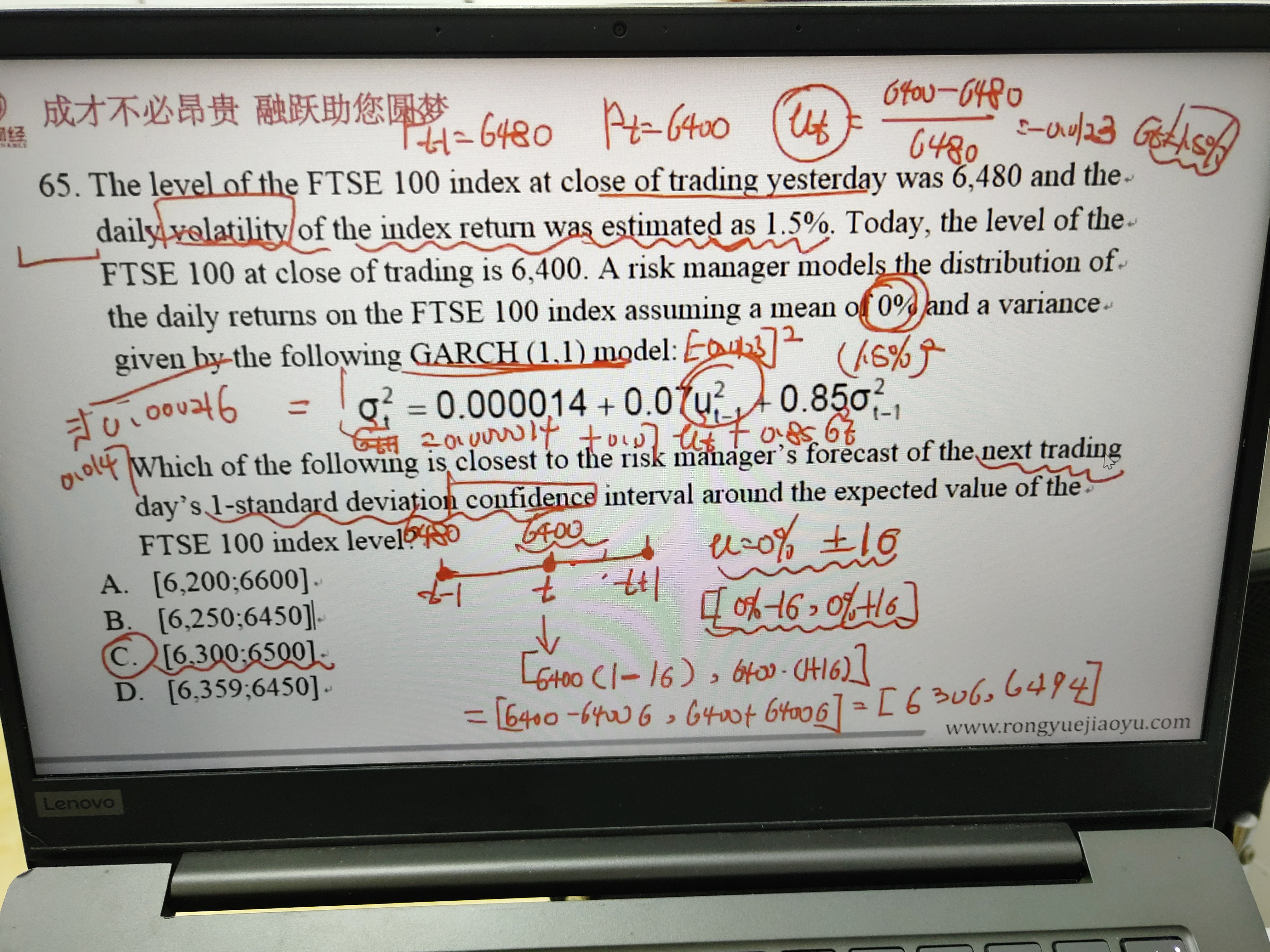 同学,因为计算的是收益的一倍标准差的置信区间,所以要用今天的6400加减一倍的标准差哈,也就是在考虑了收益率的波动后指数的变动区间;这里的ut不是均值,而是收益率哈,也就是(Pt-Pt-1)/Pt-1