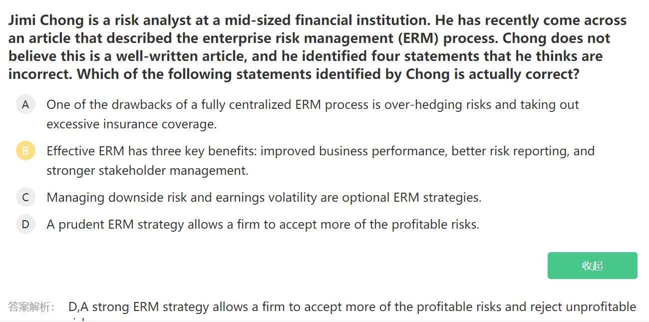 同学,B选项中说更强劲的利益相关者管理是ERM的好处是错误的哈,三大好处为管理更有效、风险报告更及时和业绩表现更好