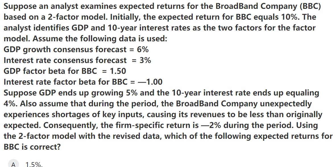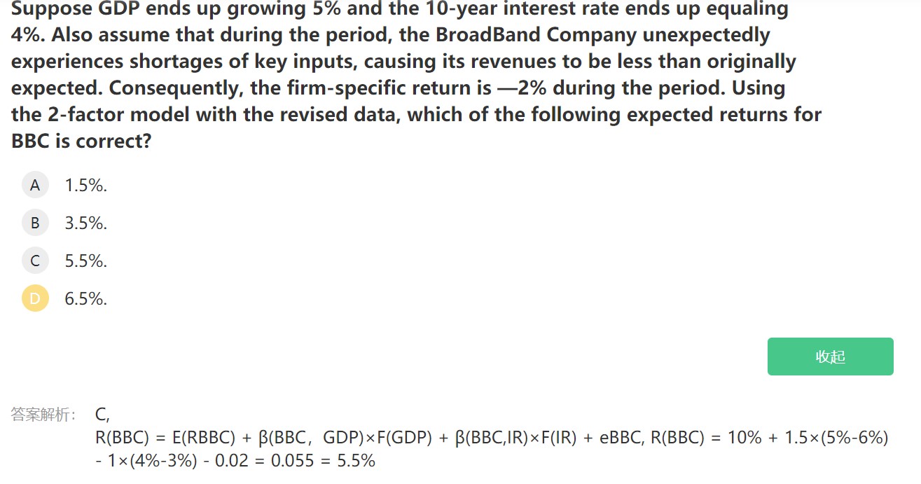 同学你好,这道题考察的是多因素模型,在多因素模型中的因子项其实是该因素的实际收益减去其预期收益,也就是常说的“surprise”。