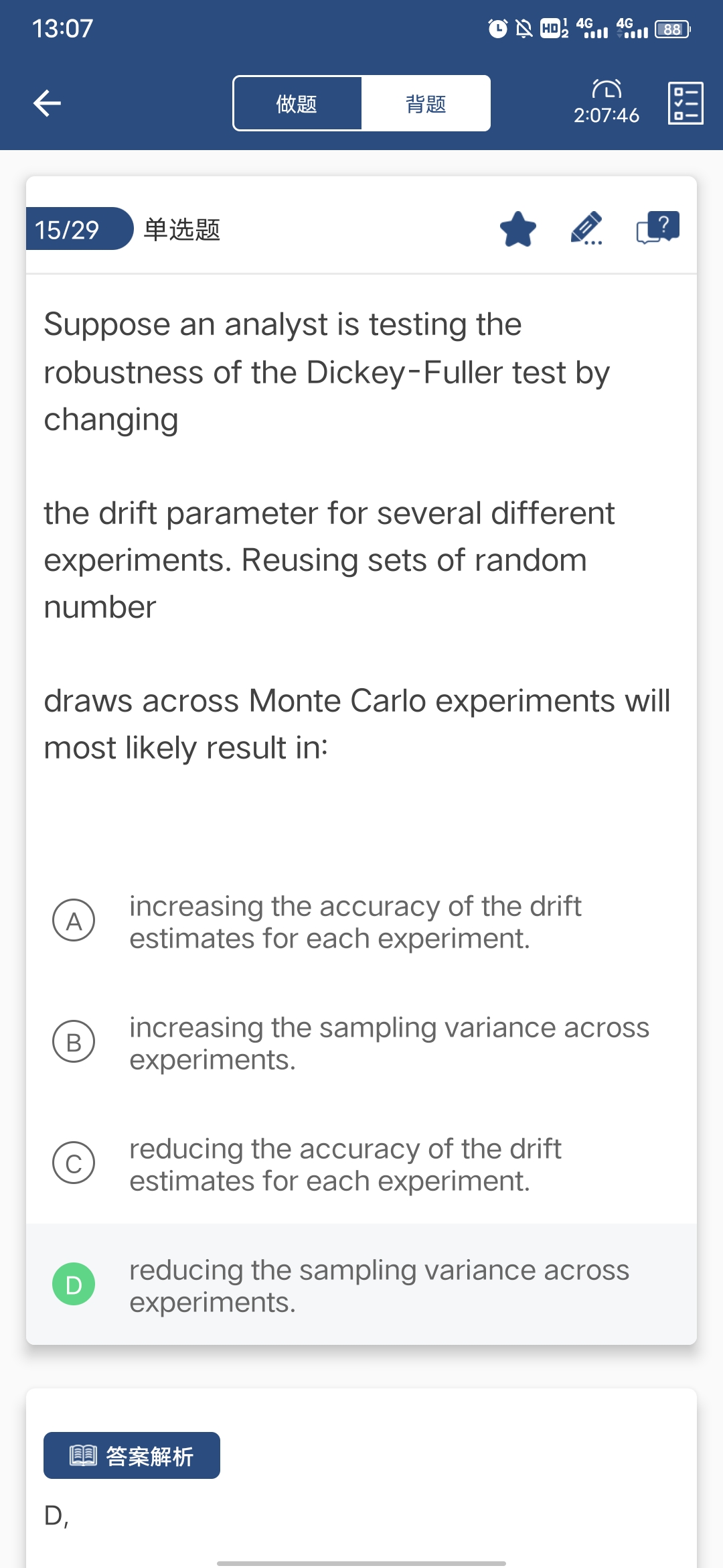 同学,这个题意思是说在每个蒙特卡罗实验中使用相同的随机数集可以减少实验中的抽样变化哈