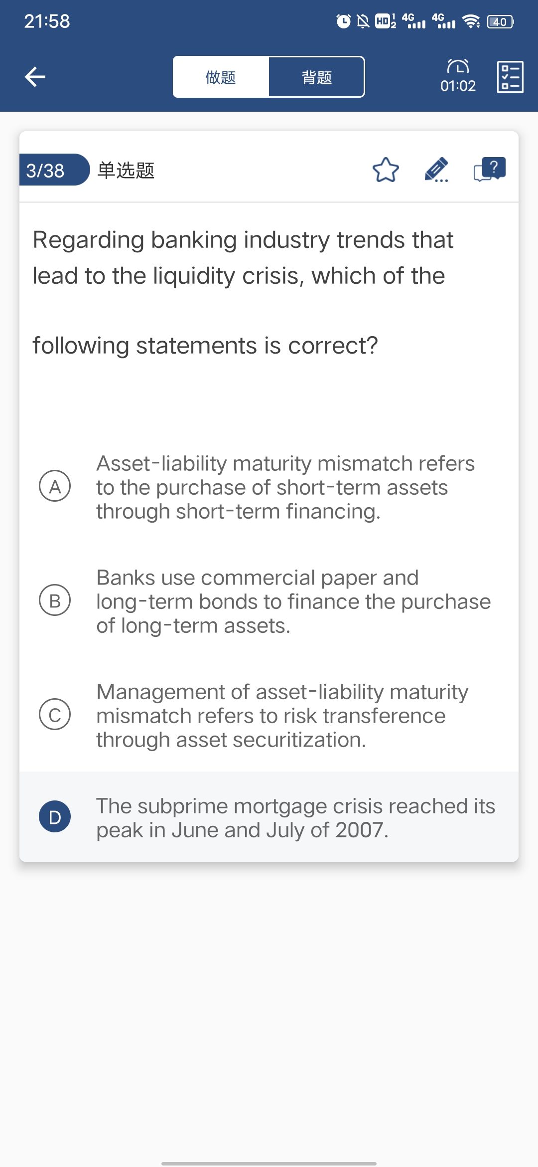 同学,C选项意思是说资产负债期限错配管理是指通过资产证券化进行风险转移,是错误的哈,证券化(而非资产负债期限错配管理)是指通过资产证券化进行风险转移。
