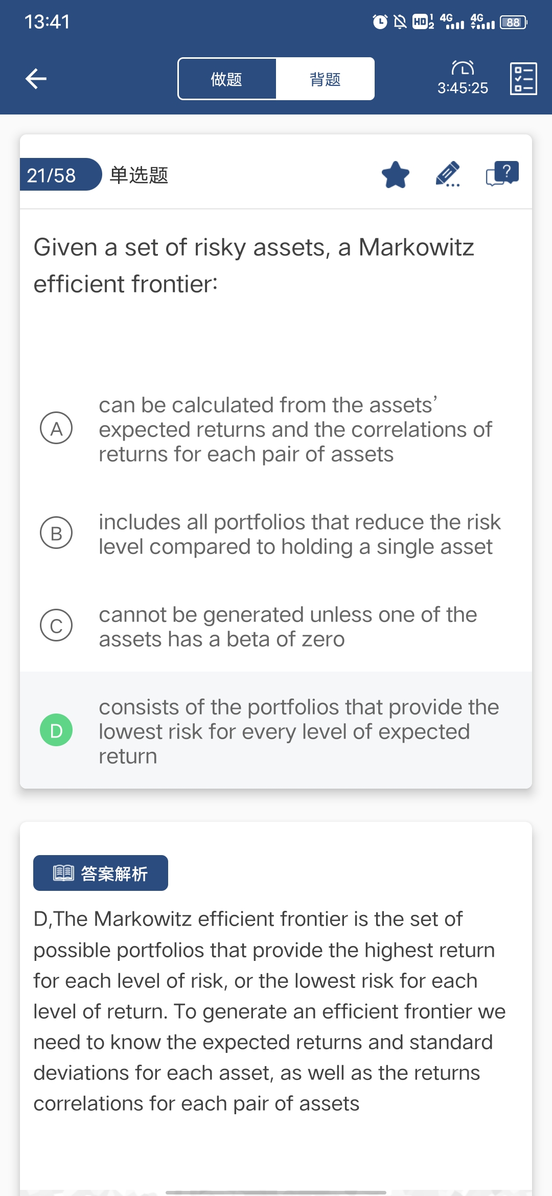 同学,B选项意思是说包括与持有单一资产相比降低风险水平的所有投资组合,是错误的哈,应该是为每个预期回报水平提供最低风险的投资组合