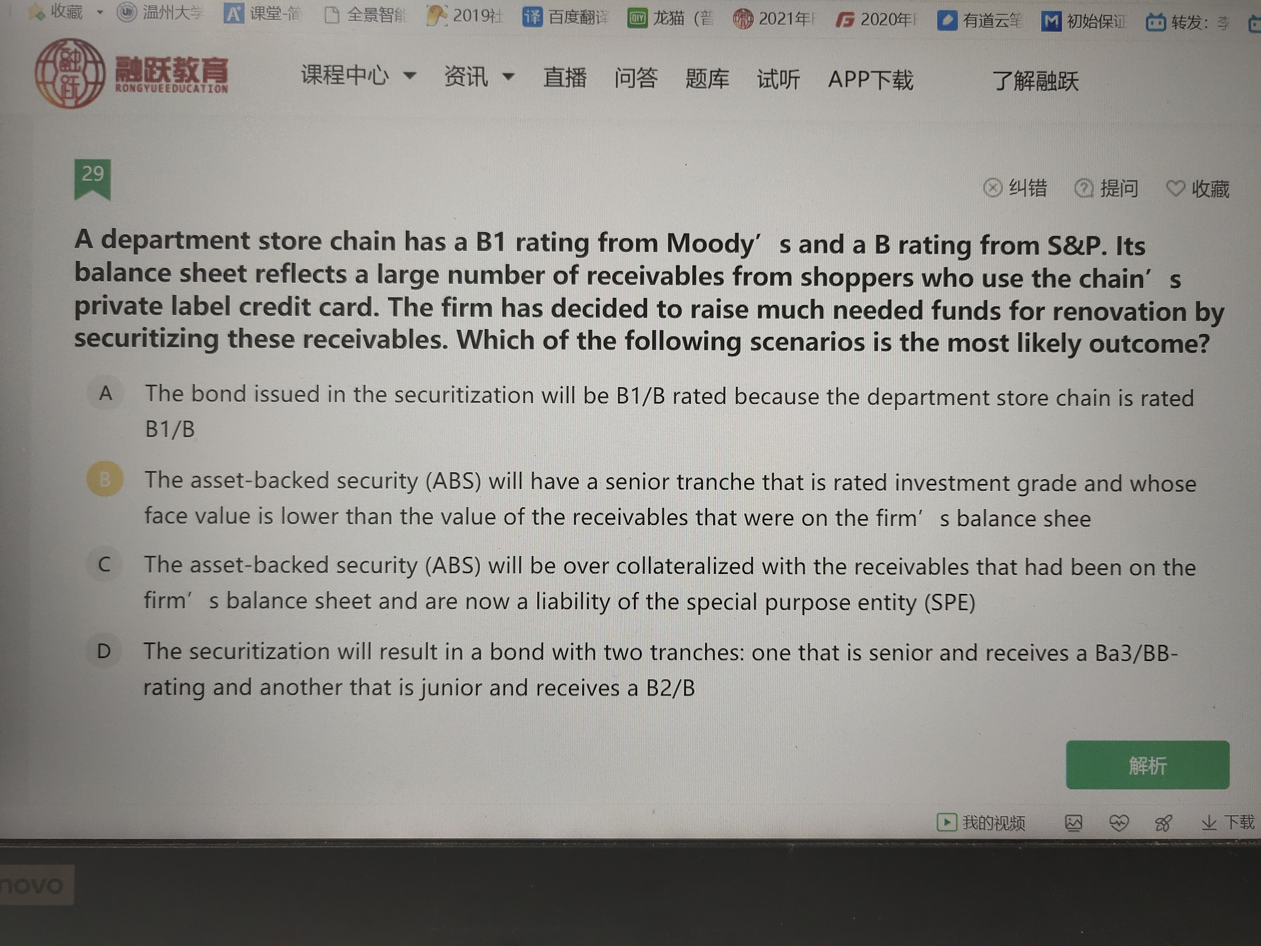 同学,题干意思是说一家百货连锁店的穆迪评级为B1,标准普尔评级为B。其资产负债表反映了使用该连锁店自有品牌信用卡的购物者的大量应收账款。该公司已决定通过将这些应收账款证券化来筹集急需的资金进行翻新,以下哪种情况是最可能的结果,A选项意思是证券化发行的债券评级为B1/B,因为百货连锁店的评级为B1/B,是错误的哈,ABS债券根据基础资产(在这些信用卡应收款中)的风险而不是资产发起人的风险进行评级。B选项意思是资产支持证券(ABS)将有一个高级部分,其评级为投资级,其面值低于公司资产负债表上应收账款的价值,是正确的。C选项意思是资产支持证券(ABS)将与公司资产负债表上的应收账款进行过度抵押,现在是特殊目的实体(SPE)的负债,是错误的哈,如果使用过度抵押,抵押物是SPE的资产而不是负债。D选项意思是证券化将导致债券分为两部分:一部分为高级债券,获得Ba3/BB评级;另一部分为初级债券,获得B2/B评级,是错误的,高级部分通常为AAA级