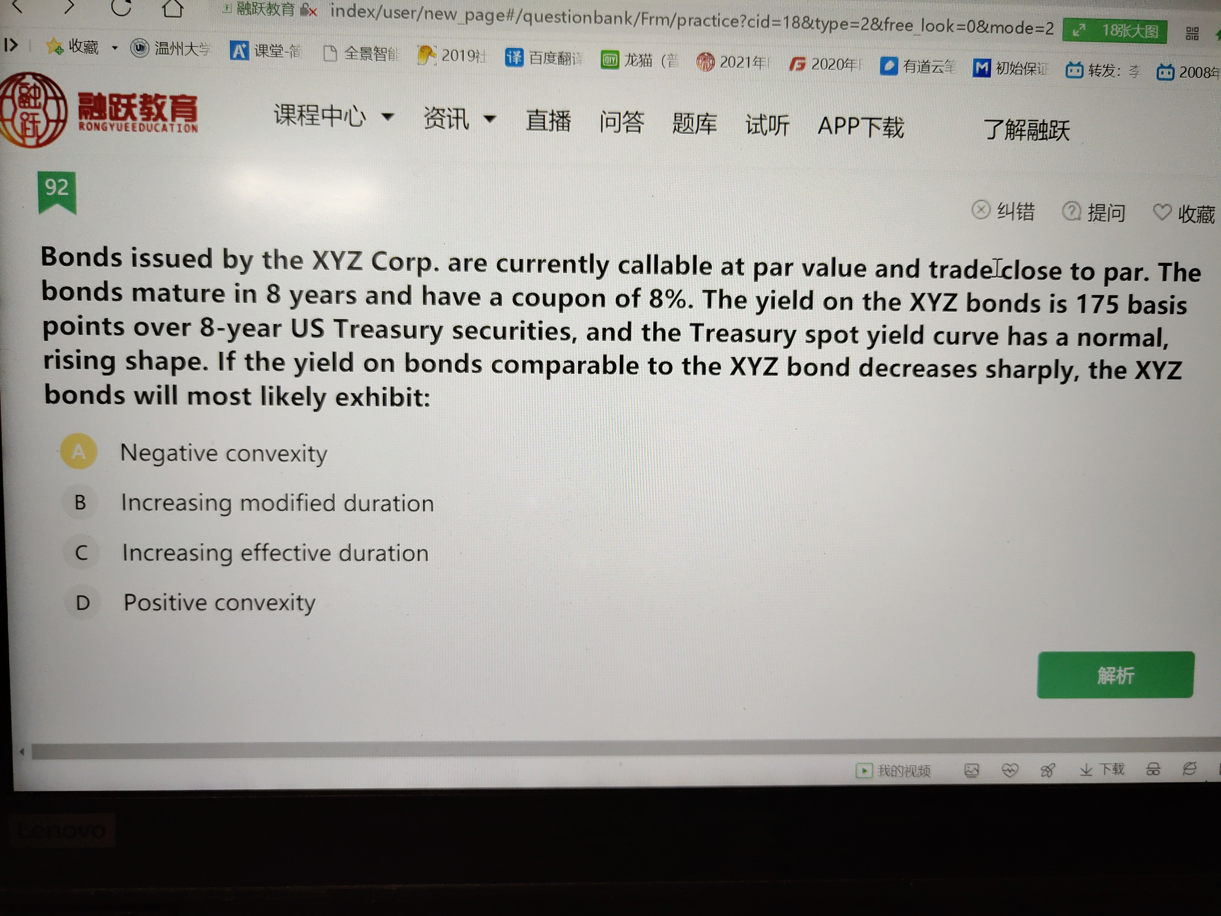 同学你好,对于可赎回债券而言,当利率急剧下降时,将有可能出现负凸度的情况,从callable bond的图形就可以看出来。