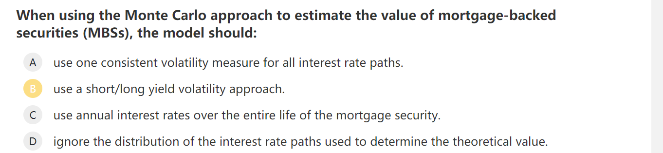 同学你好,这道题的意思其实就是考察蒙特卡洛模拟方法的思路,因为蒙卡模拟可以模拟出不同的利率变化路径对标的资产价格的硬性,而对利率模拟最靠谱的方法(也是一般常用方法)就是利用利率期限结构法(即利用不同长短期期限的即期利率来进行模拟,可以是常见的向上倾斜也可以是利率倒挂),A选项中的只用一个利率波动率来模拟显现不对,C选项中的用年化利率来模拟也不对(因为年化利率就相当于YTM ,没有即期利率来的更精确),D选项中违背了蒙卡模拟的基本原则(概率分布和路径依赖)也不对,B选项中的长短期收益率波动率符合前面讲的利率期限结构理论,所以是正确的。