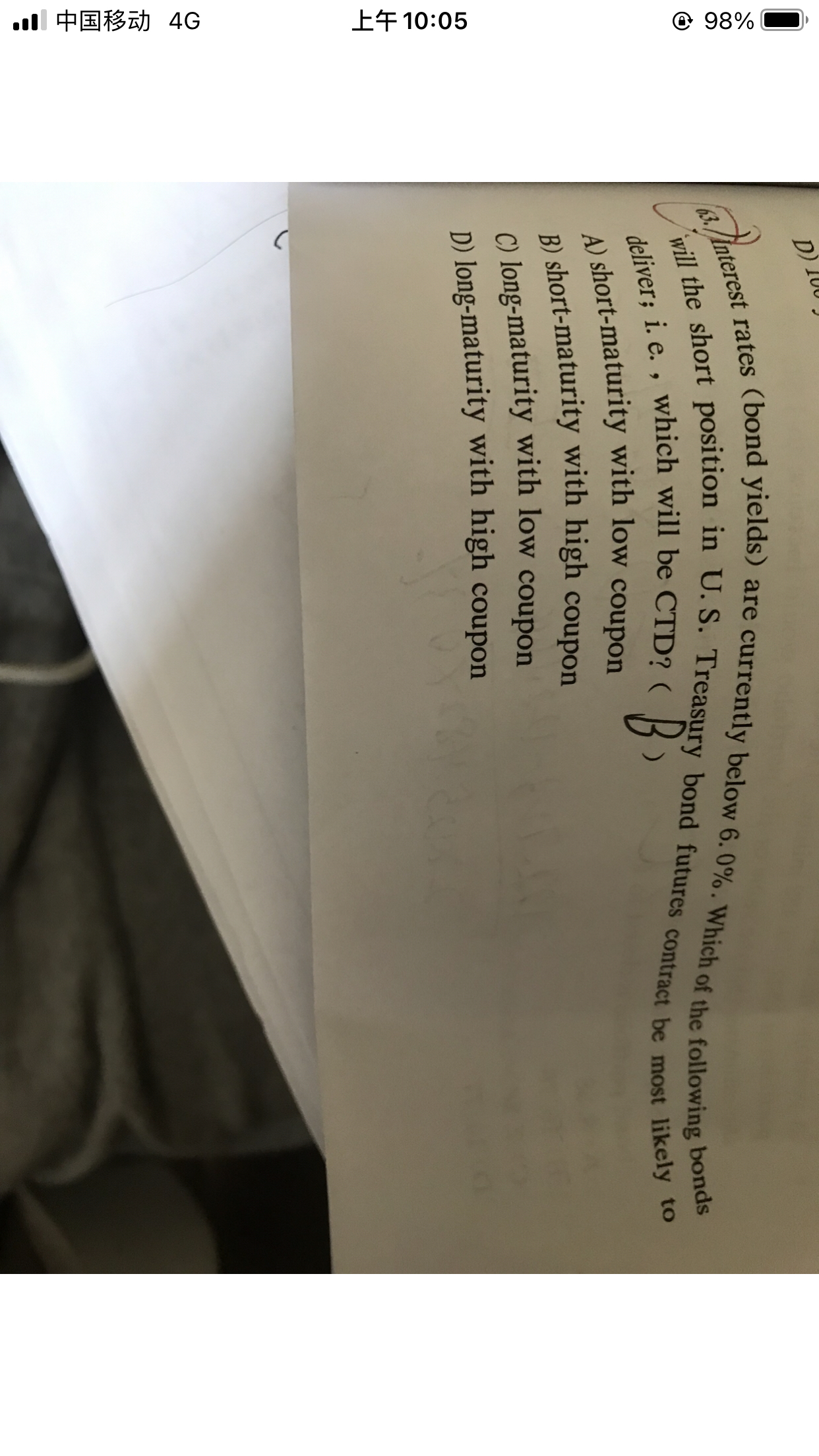 同学,CTD意思是说最便宜可交割哈,这个题目是让我们选出最便宜可交割债券,根据cost的公式和对于bond yield 是否大于6%的判断就可以选出正确选项哈,选择最便宜可交割债券是课程中的重要知识点,建议回顾课程哈