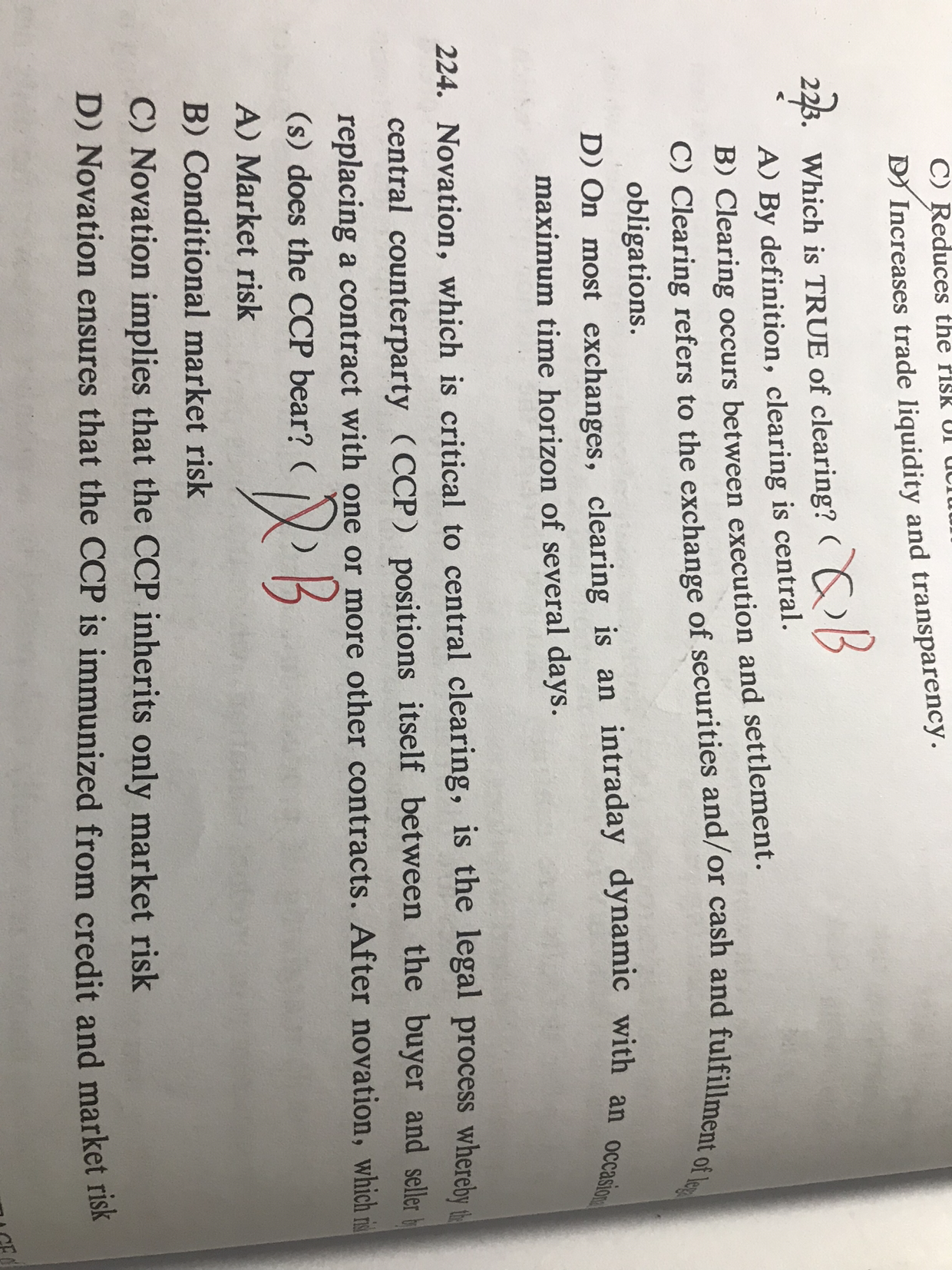 同学,B选项是在一定条件下的市场风险,题干中问的是novation后,CCP承担哪些风险,所以选择B选项,了解即可,不用过多纠结哈