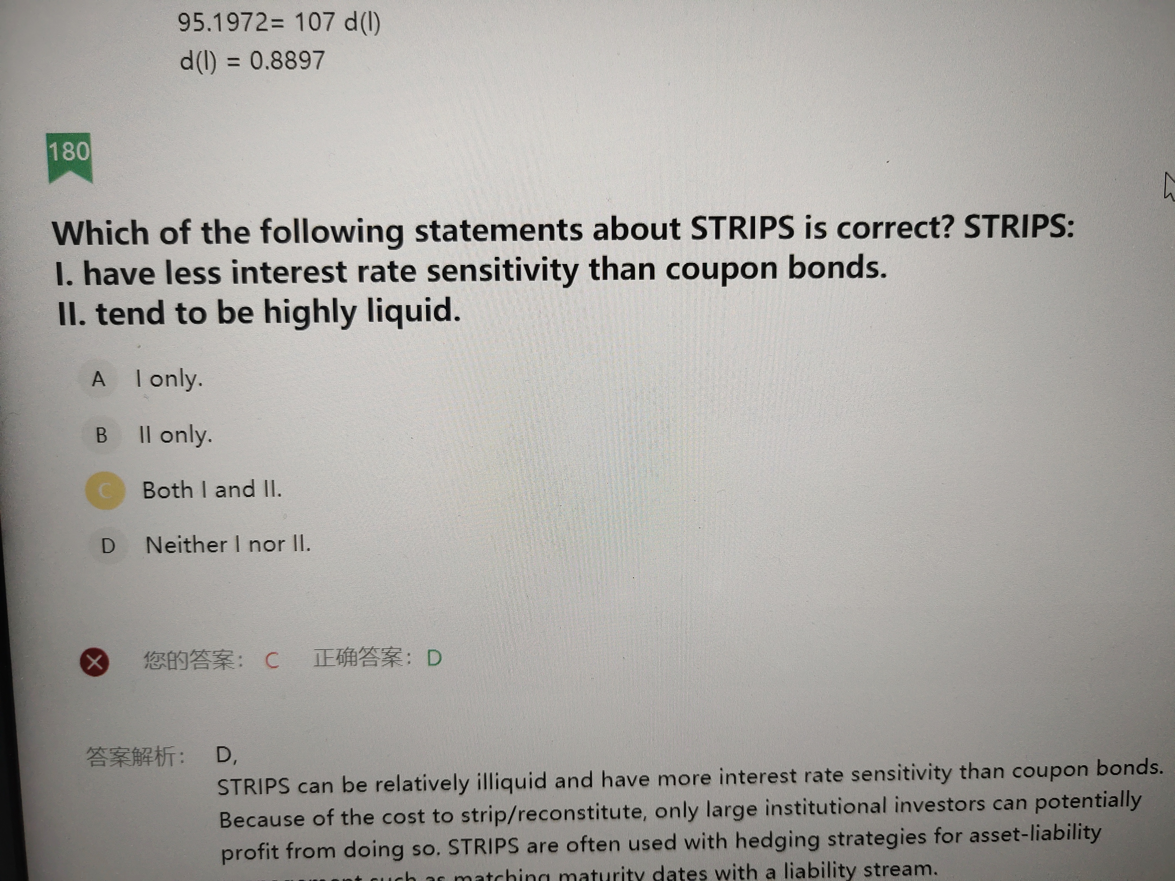 同学你好,strips是资产剥离证券,极端情况就是把一个含息债券剥离成一个纯本金债券PO和纯利息债券IO,剥离后,当利率变动时,受提前还款的影响,两者的价格波动更大,而这种证券在实务中一般都是机构投资者用于资产负债管理用的,所以流动性较差。