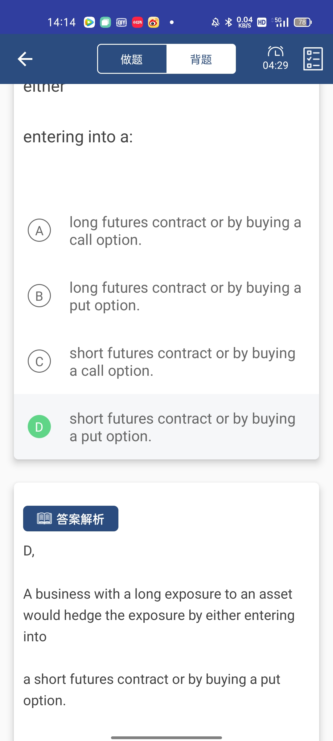 同学,我们需要用空头头寸来对冲多头头寸,如图所示,只有D选项可以构造出空头头寸哈