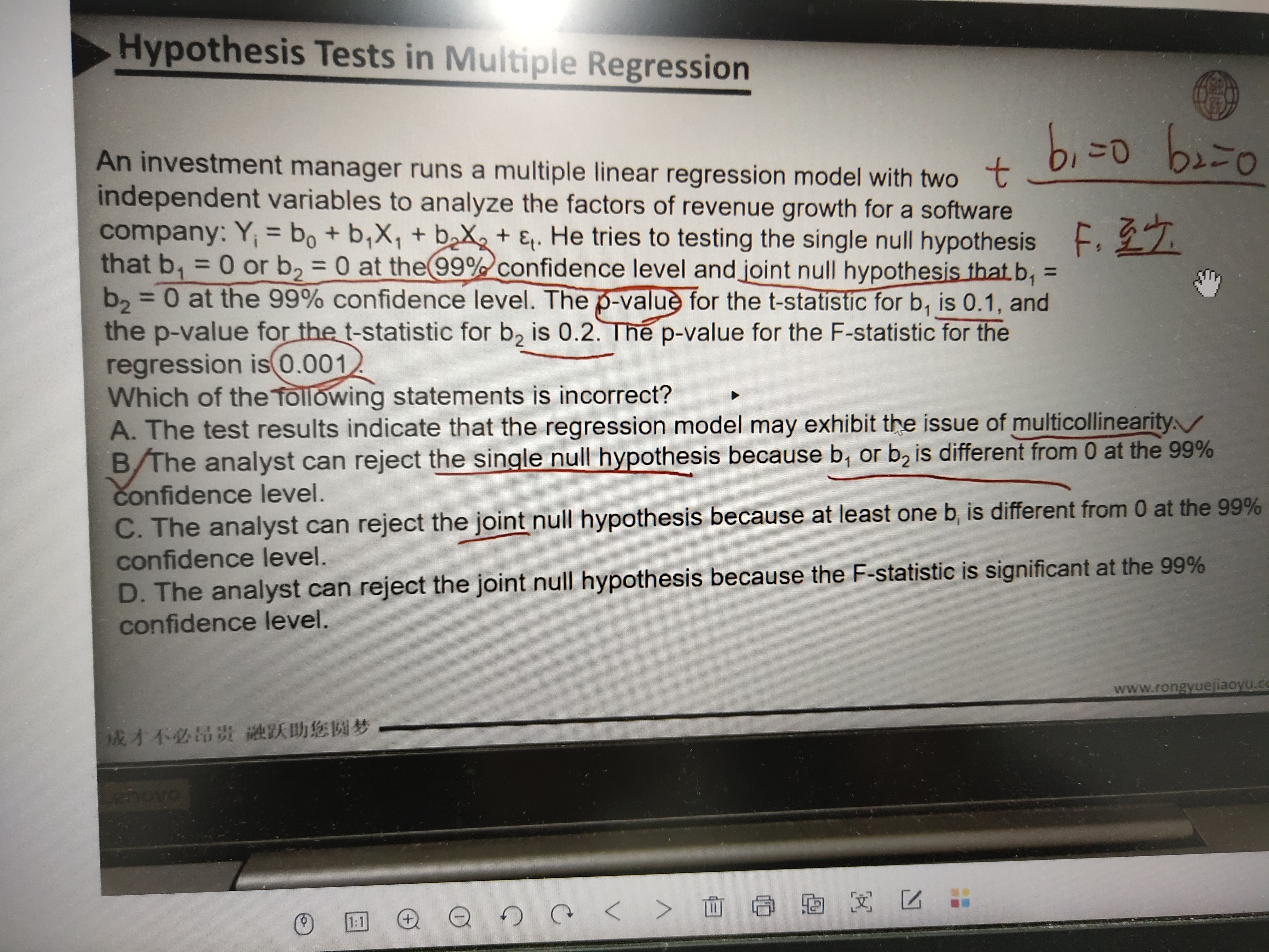 同学,至少有一个b不等于 0就可以拒绝原假设了哈