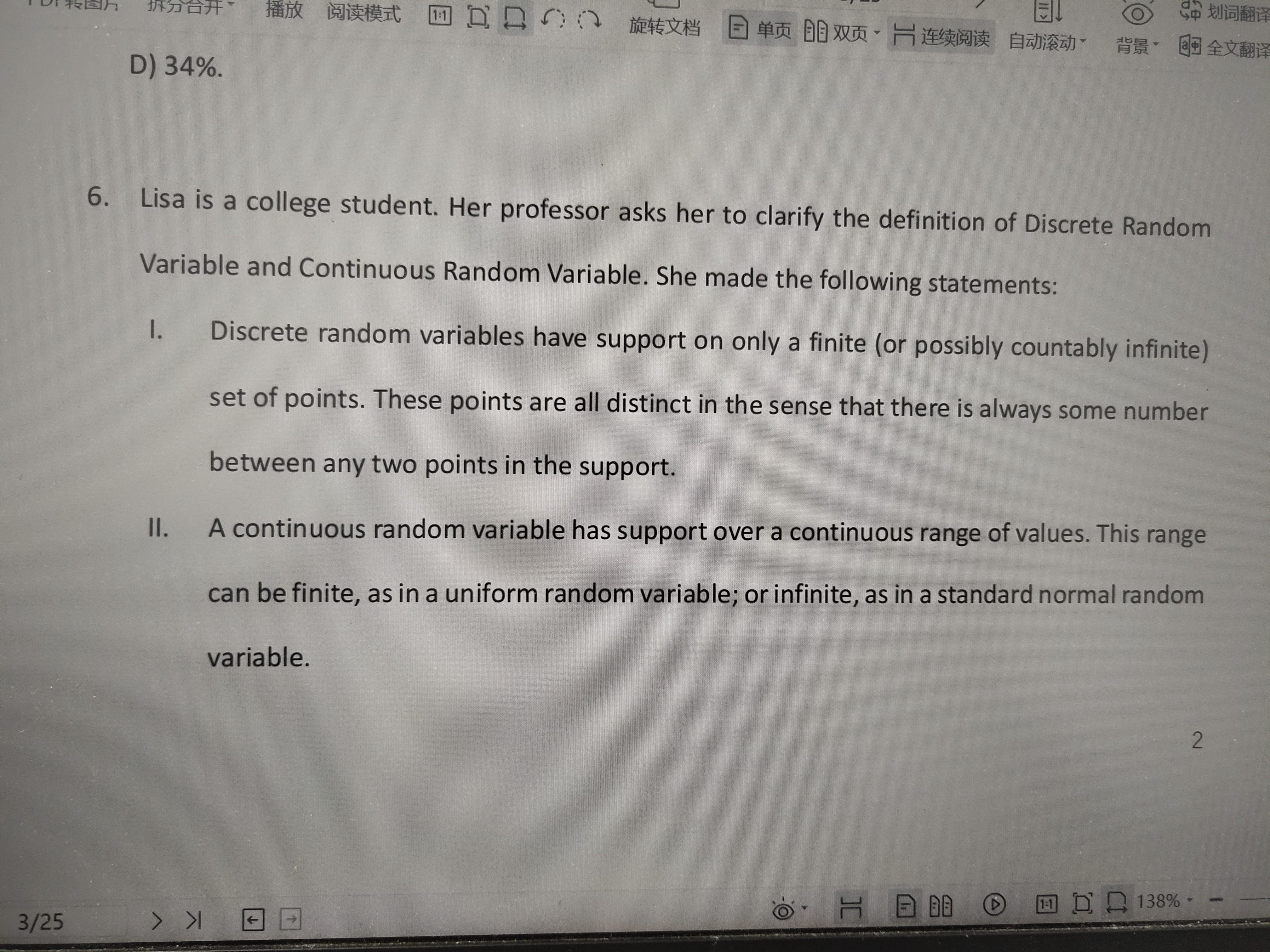 同学,第二句话意思是说连续随机变量支持连续范围内的值。这个范围可以是有限的,如在统一随机变量中;也可以是无限的,如在标准正态随机变量中。