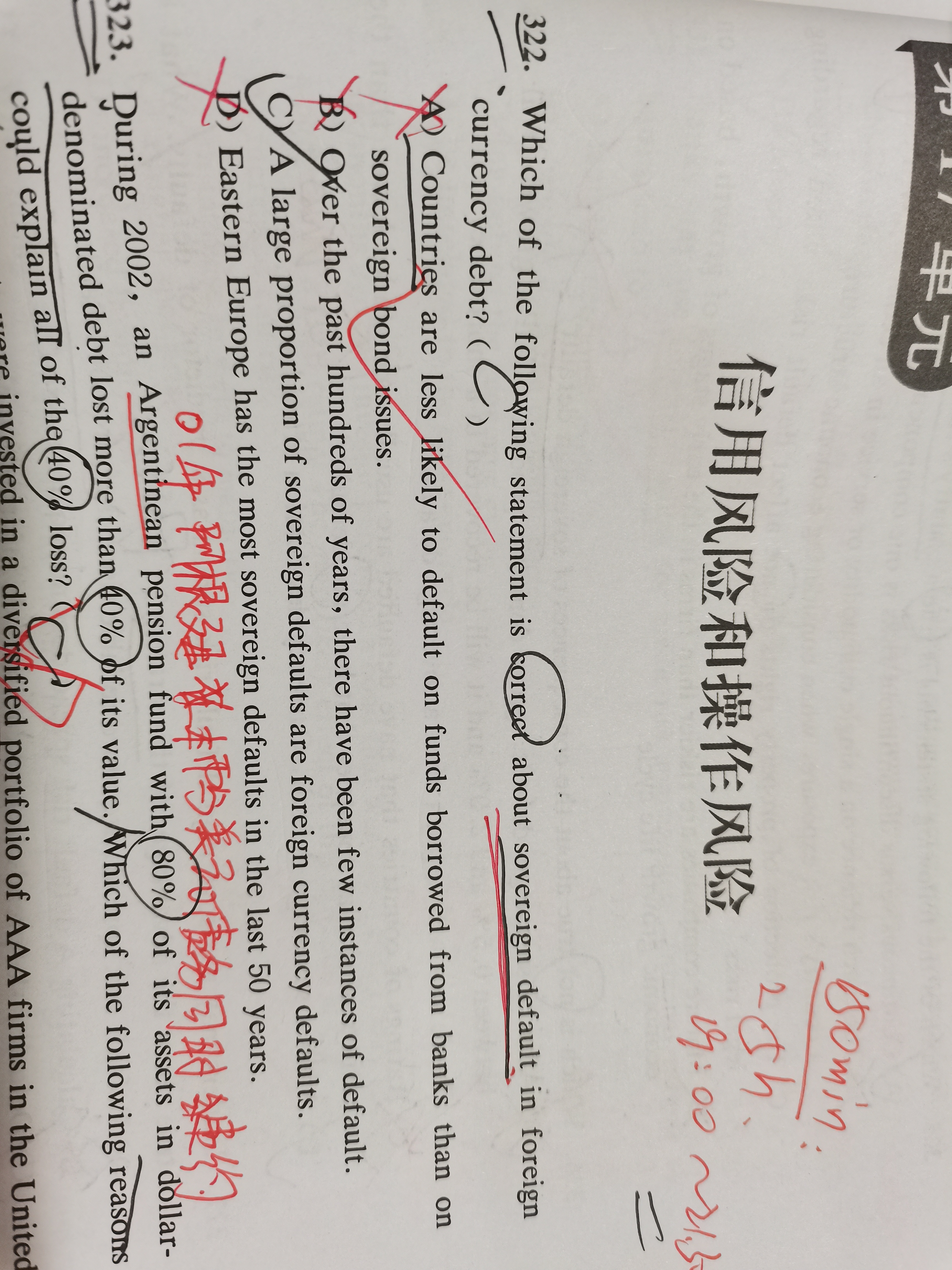 同学,题干意思是说关于外币债务的主权违约,下列哪个说法是正确的,A选项,与主权债券发行相比,国家向银行借款违约的可能性更小,是错误的,主权债券的违约可能性更小;B选项,在过去的几百年里,很少有违约的例子,很明显错误;C选项,大部分主权债务违约都是外币违约,是正确的,发行主权货币(而非使用外币),不背负大量外币债务,且利率控制得当(不疯狂加息)的国家,除非政治上违约,不可能发生主权债务违约;D选项,在过去50年里,东欧国家的主权债务违约最多,是错误的哈