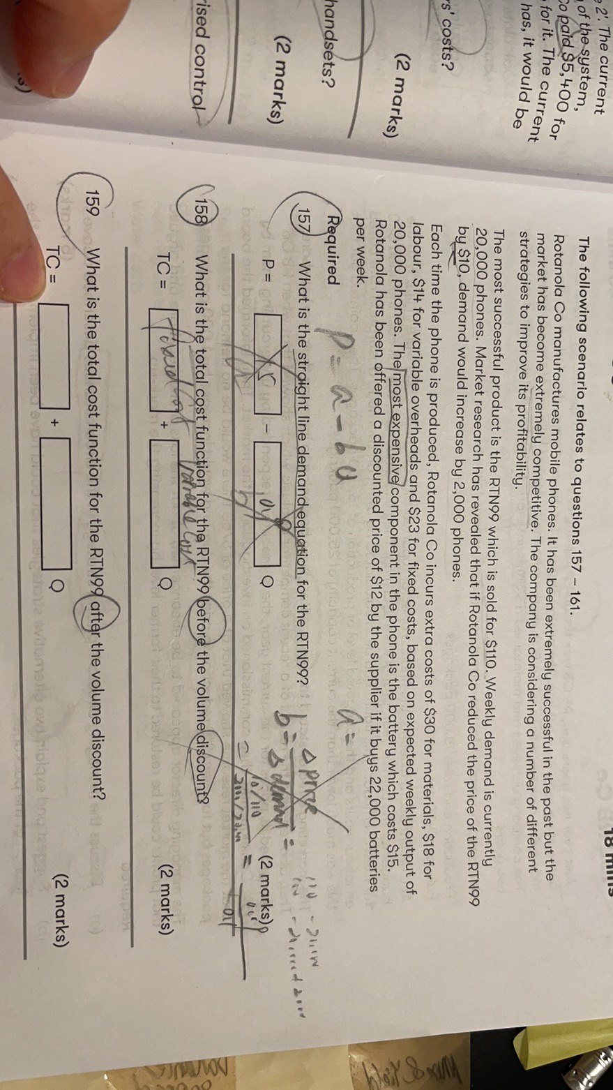 同学,P=a-bQ,根据需求上升2000,价格降低10来计算b=10/2000=0.005,又已知价格是P=110时,Q=20000,代入计算算出a=210。