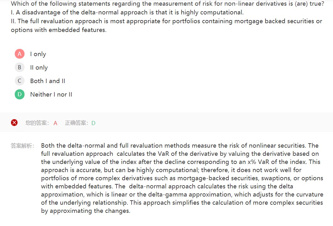 同学,解析中说完全重估方法是在指数的x% VaR下跌后,根据指数的基础价值对衍生品估值,从而计算衍生品的VaR。这种方法是准确的,但可能是高度计算的;因此,它不适用于更复杂的衍生品投资组合,如抵押贷款支持证券、互换或具有嵌入特性的期权。第二句话说适用,所以也是错误的说法哈