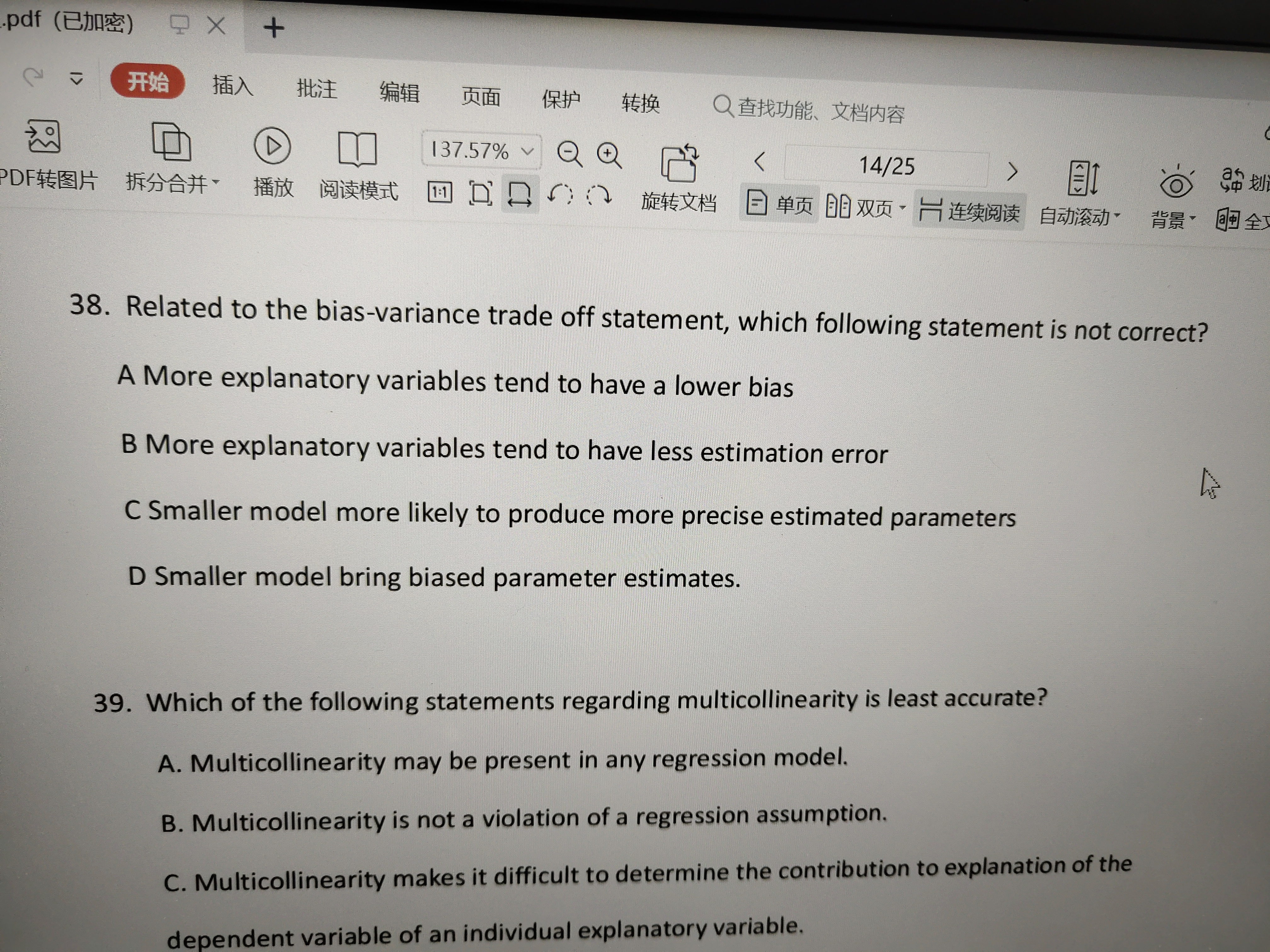 同学,一个是说解释样本内因变量变化的程度,一个是说在样本外的表现,具有过多解释变量的模型(即过拟合模型)可以很好地解释样本内因变量的变化,但在样本外表现不佳。另一方面,较小的模型具有较高的样本内方差误差,但在样本外表现好,偏差小更精确,是相对来说的,掌握知识点即可