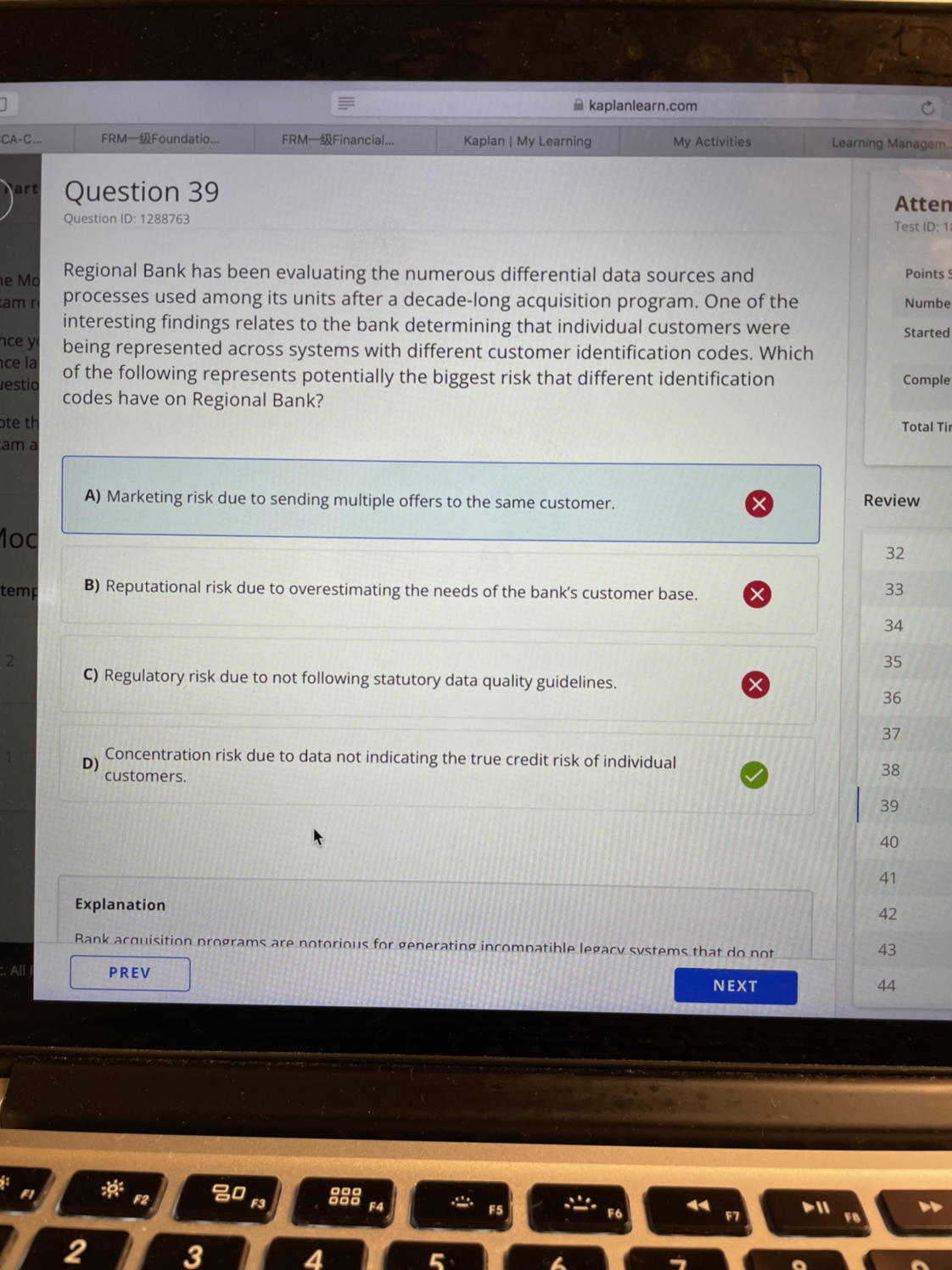 同学,题干中说银行确定个人客户在不同的系统中使用不同的客户识别码,问的是以下哪项可能是不同识别码对区域银行造成的最大风险,如果数据没有表明个人客户的真实信用风险,或者说不同的客户识别码不能将个人客户分散到不同的系统中,就会产生集中度风险哈,了解即可,像这种举例分析的题目比较考验我们的理解能力哈
