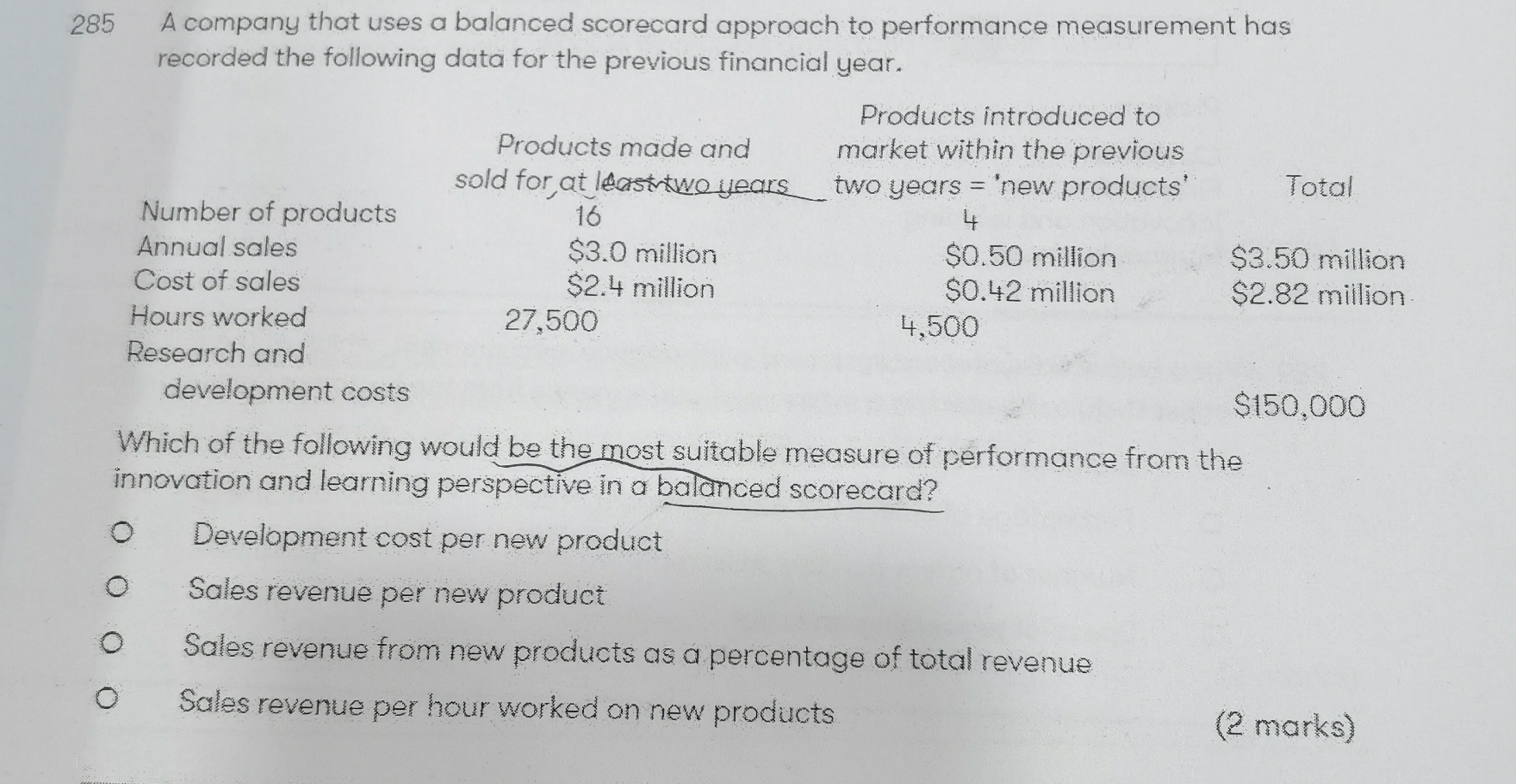 同学,题干分别给出老产品和新产品的销售数量,销售收入,成本,小时数等等情况,题目问的是可以作为创新方面的最合适的,创新对应的是新产品,最能体现好不好的肯定也是销售收入,那么你衡量好不好就用其占总的百分比。答案是第三个。