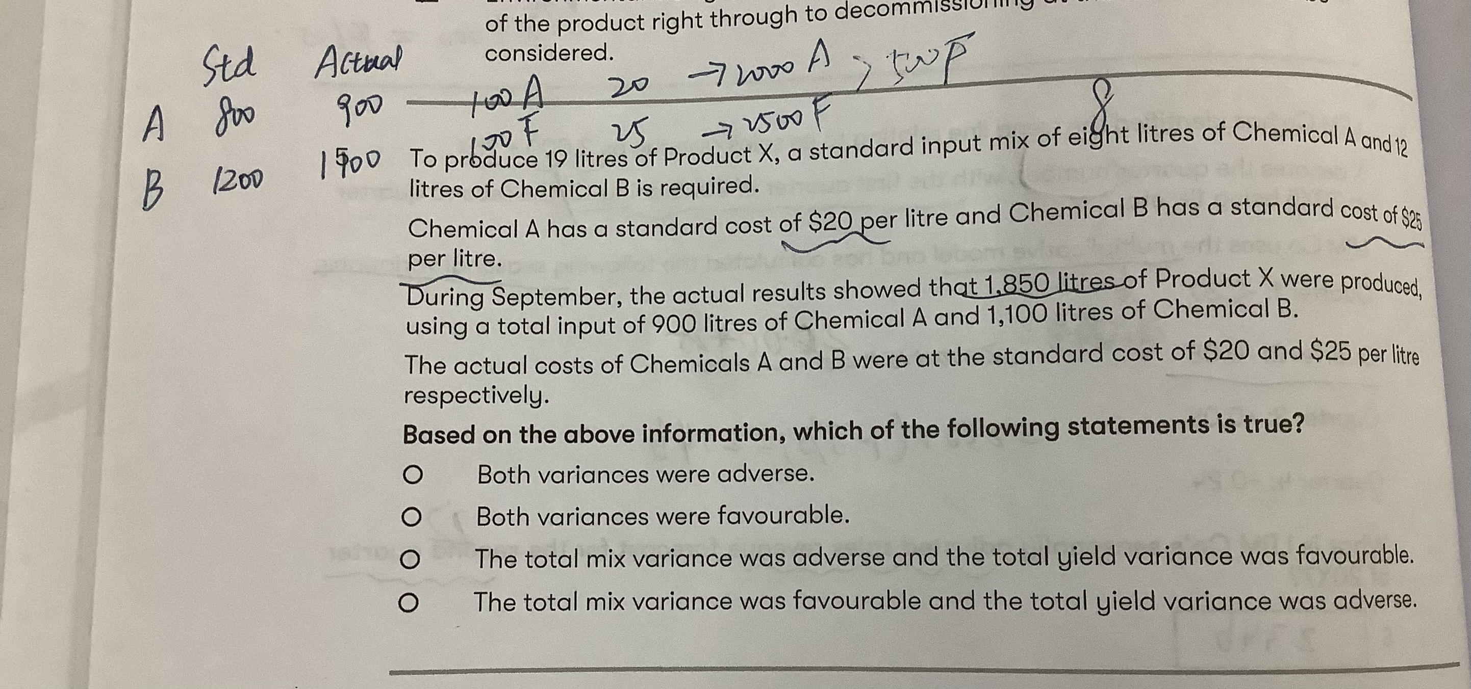同学,可以先用含义判断,先判断mix混合比例问题,实际的input比例是900:1100,标准的input比例是8:12,是A占比偏多,而A相较于B便宜,即便宜的用的多,是F;yield是量的问题,实际output1850应该使用的量是1850/19*8=779和1850/19*12=1168跟实际使用的量900和1100相比,总和相比实际用量比标准的多,是A。或者也可以直接跟答案一样列出具体的计算得出答案。