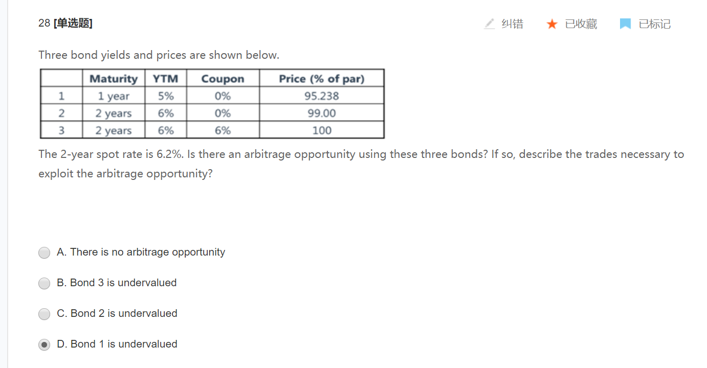 同学,这道题用不到这两个数据,题意是要通过一和二构造三的现金流,判断哪个被低估的。 这个spot 给的随便给的条件,ytm和spot之间是有关系的,ytm是平均收益率,也相当于spot rate的平均值,所以用两种计算出来的债券价格是应该是一样的。这里不用考虑这个。
