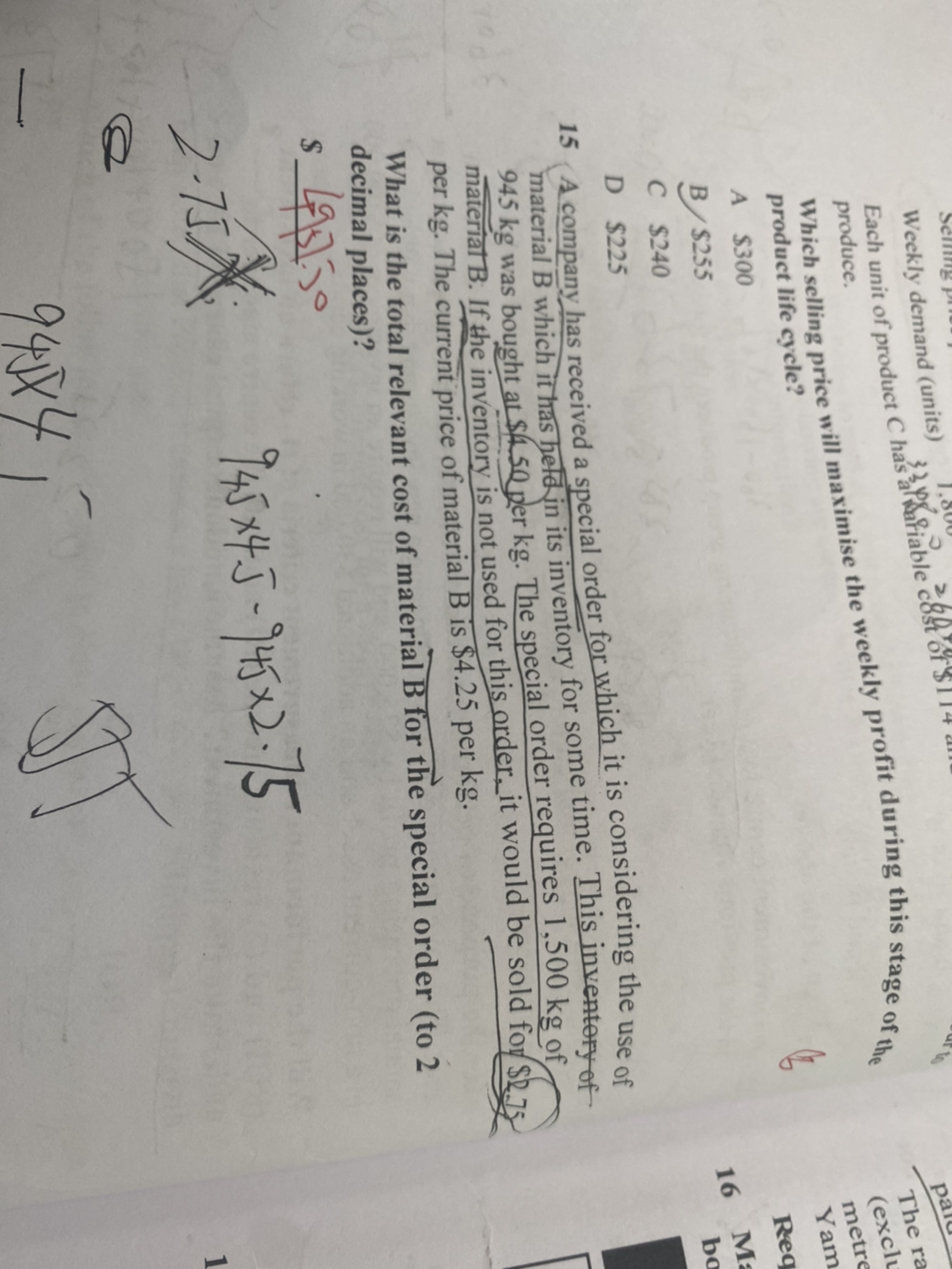 同学,题目考察的是相关成本的计算。首先该笔订单需要的1500kg需要分开来看,其中945kg,在本公司的存货里是有的,而且不用就会卖的,那这部分的成本就是卖出的价格945*2.75,另一部分555kg,需要想外面购买,现在的价格是4.25,那么这部分的成本就是555*4.25,两者相加就是总的相关成本。