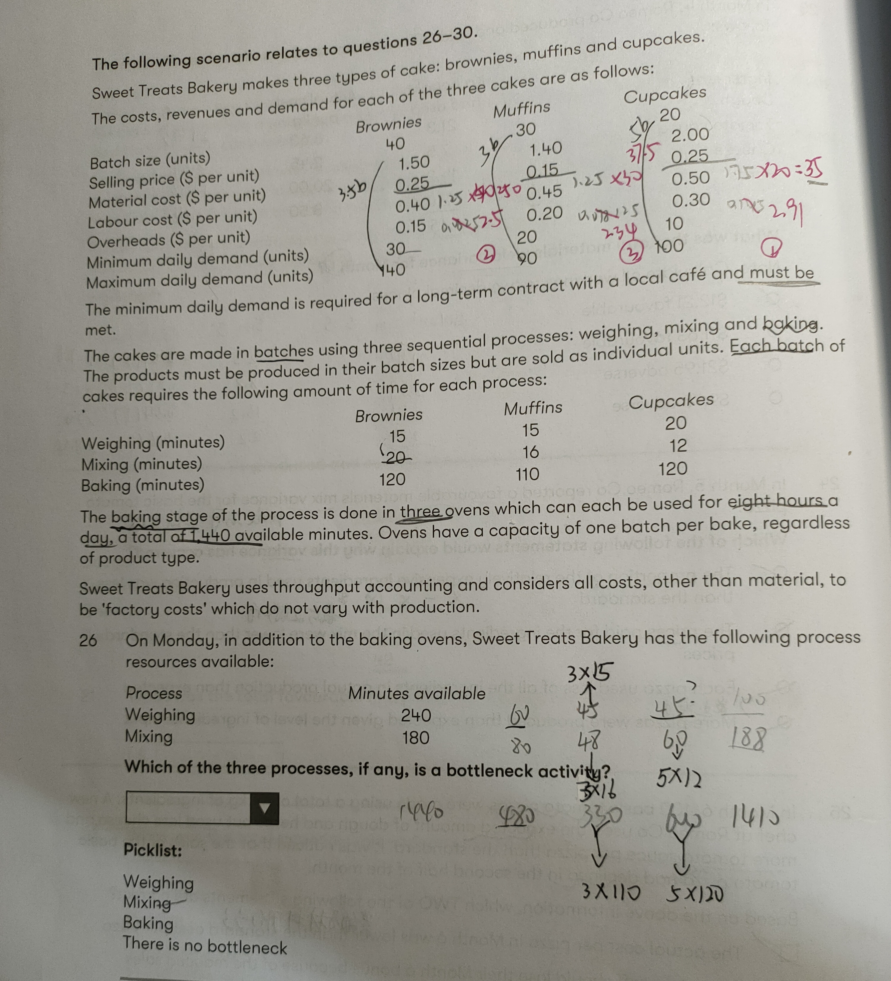 同学,答案将各计算结果写的很清楚,分别算出各产品在各种流程的时间,加总后得出总时间,再与Available minutes进行对比,比Available minutes多的就是稀缺的。