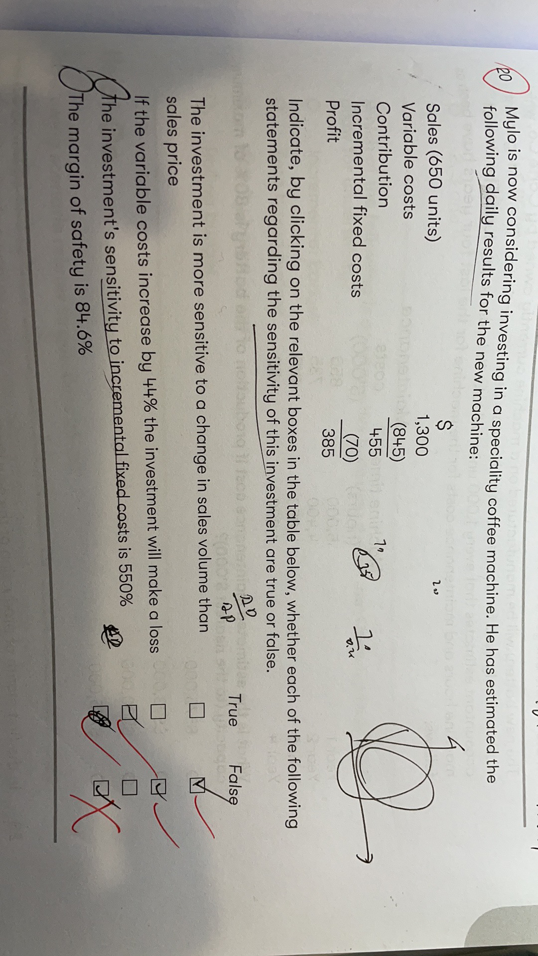 同学,BEP in unit=70/455/650=100 margin of safety=(650-100)/650=84.6%.