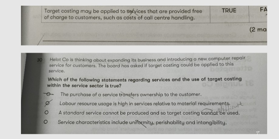 同学,第一题题目有很大主观性的,真正考题不会出现这种问题的,平时做练习自己了解就好。考官可能认为呼叫中心处理成本中可能通话时长不一没法预料,所以没法使用标准成本,但是国内的情况是通话接通免费所以比较好控制的。理解:”target costing在理论上是可以适用于所有的行业的,但需要具体行业具体来分析,有些行业比较困难“就可以的。