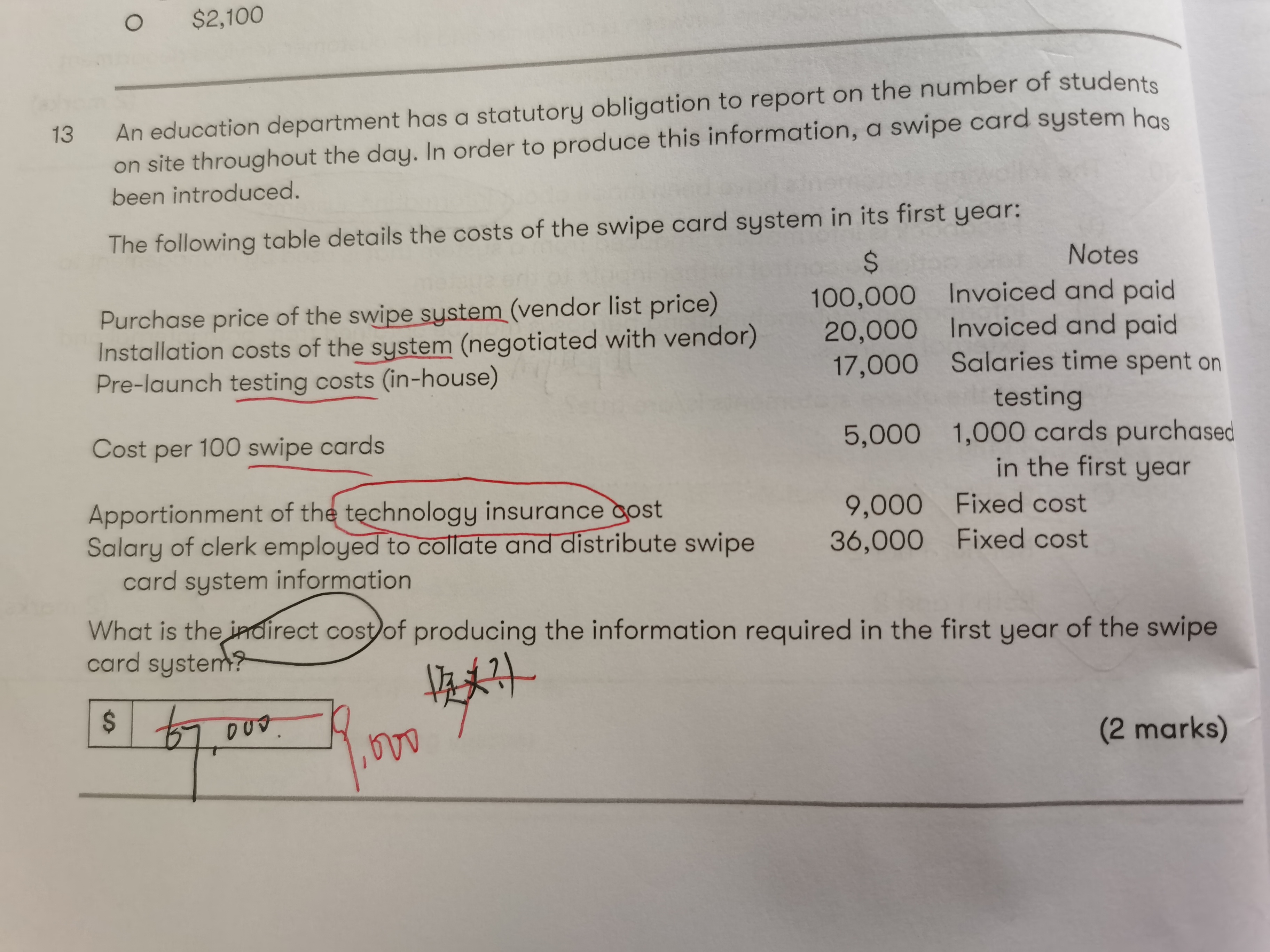 同学,题干描述的各种成本只有9000是indirect cost间接成本,是技术保险费分摊过来的。