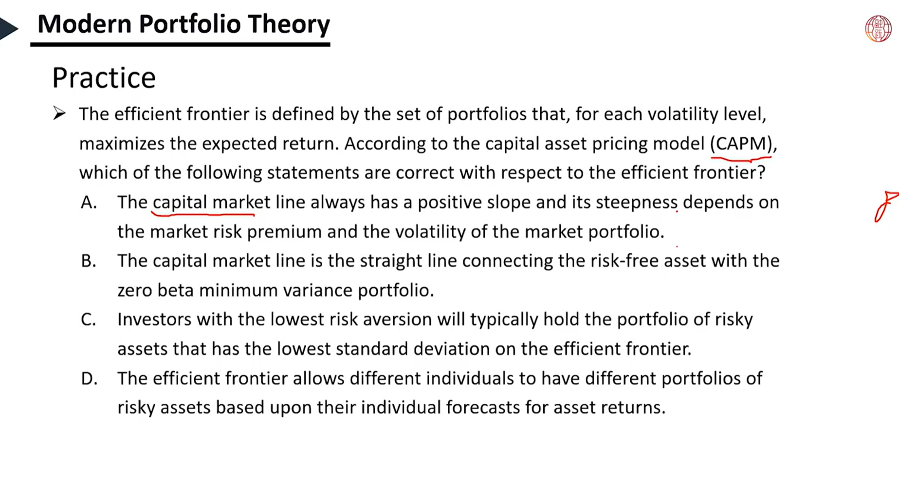 同学你好,C选项错在应该是风险厌恶程度最高的投资者才会选择有效前沿上标准差最小的点;D选项错在有效前沿的假设之一就是市场上的投资者对资产收益都有一个相同的预期,而不是各自的预期。
