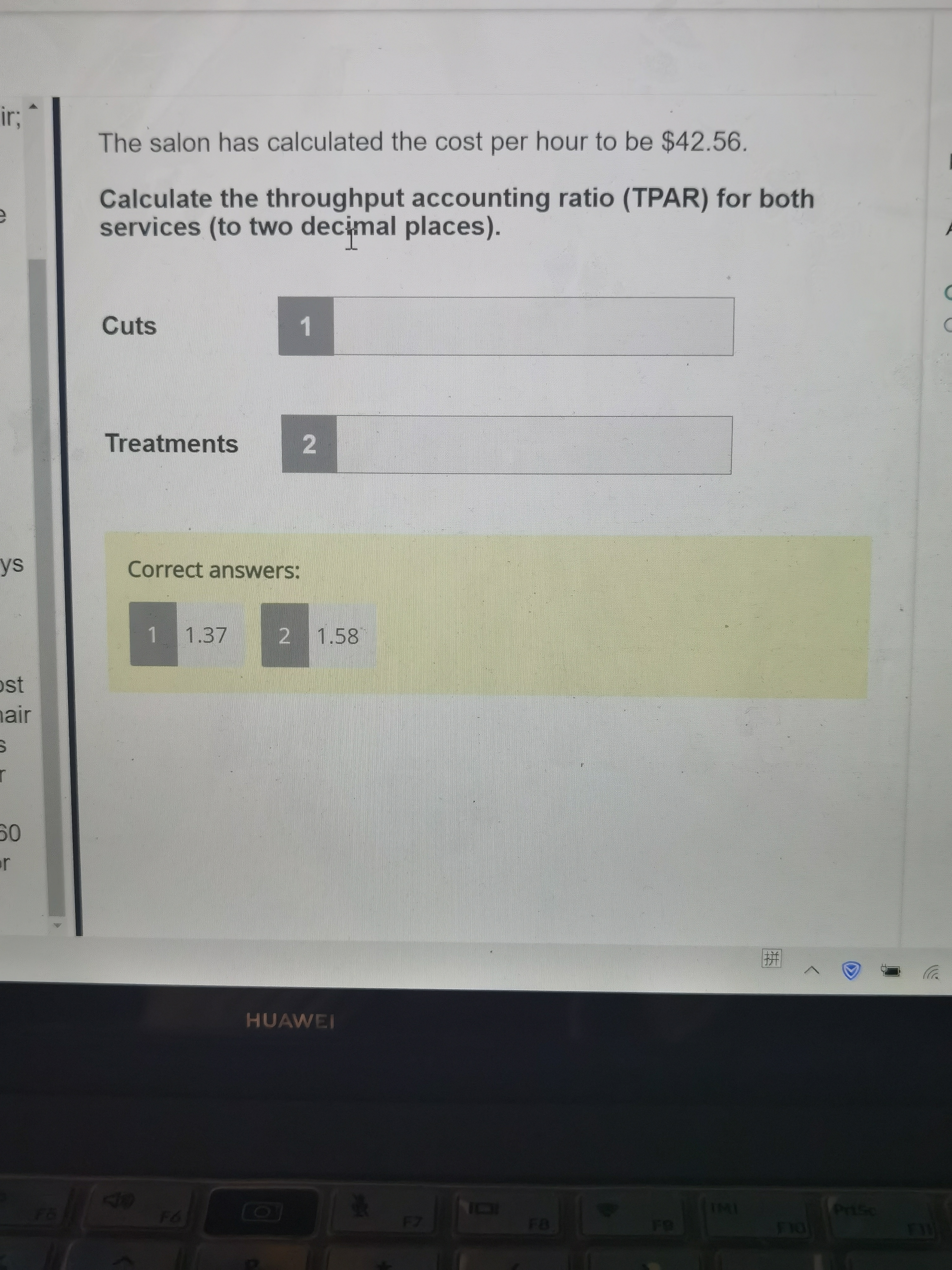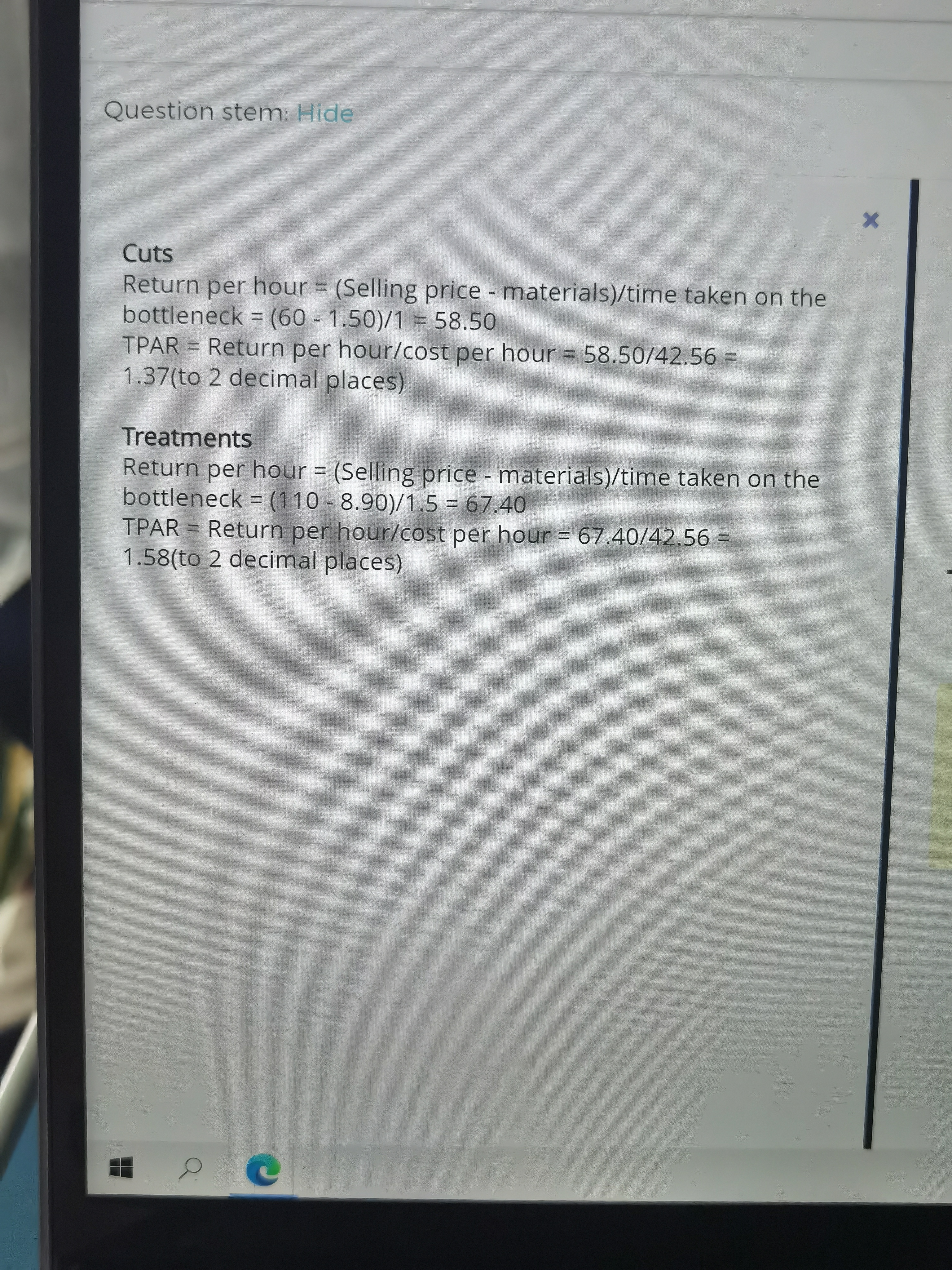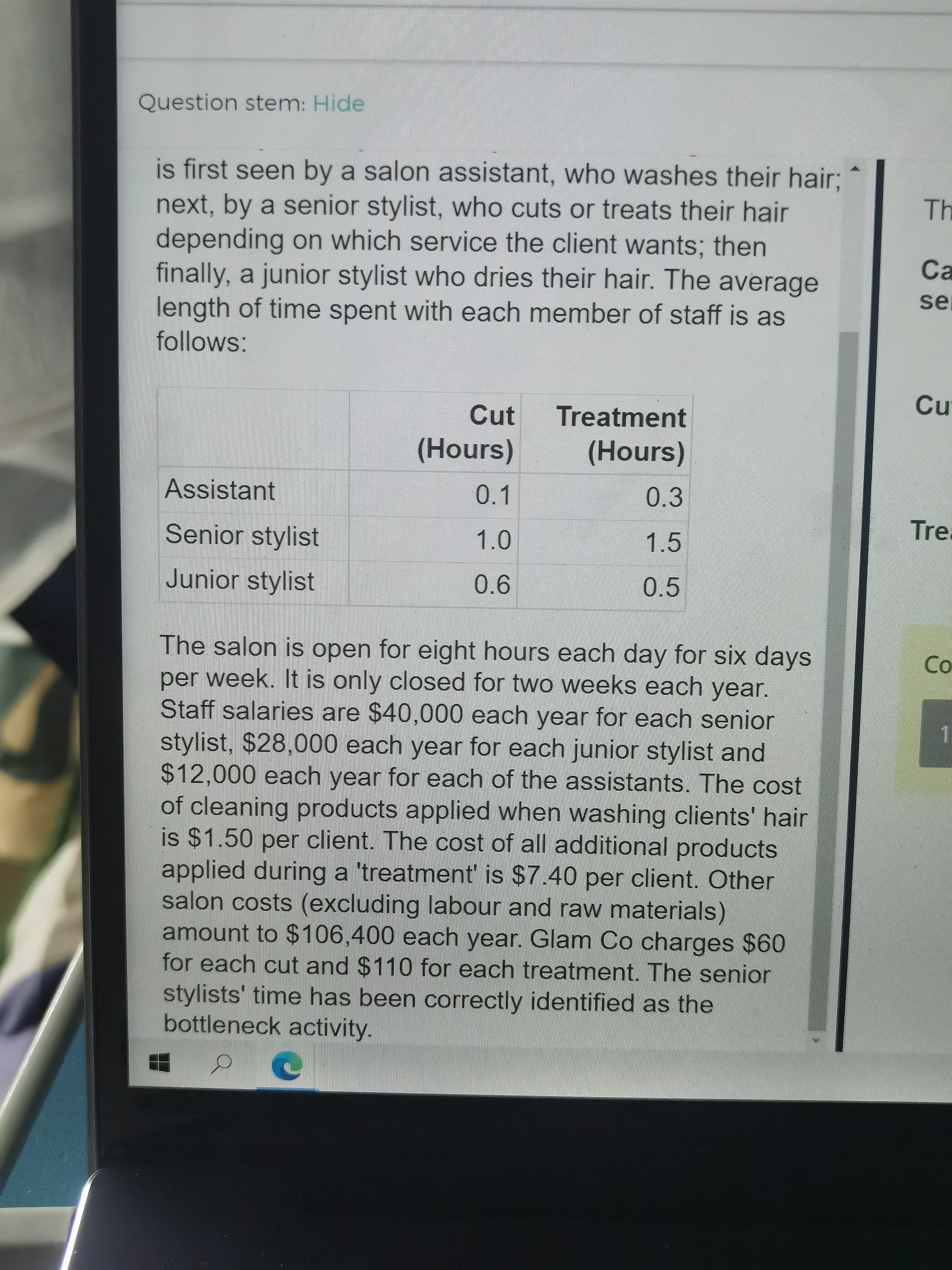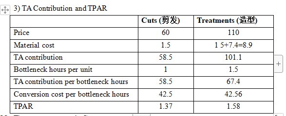 同学,题目中描述“The cost of cleaning products applied when washing the hair is $1.50 per client. The cost of all additional products applied during a 'treatment' is $7.40 per client. ”那么只剪发是1.5,做造型是1.5+7.4=8.9。具体计算如下图所示。