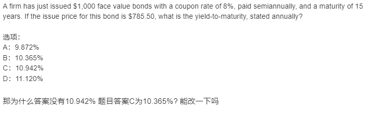 那为什么答案没有10.942% 题目答案C为10.365%? 能改一下吗