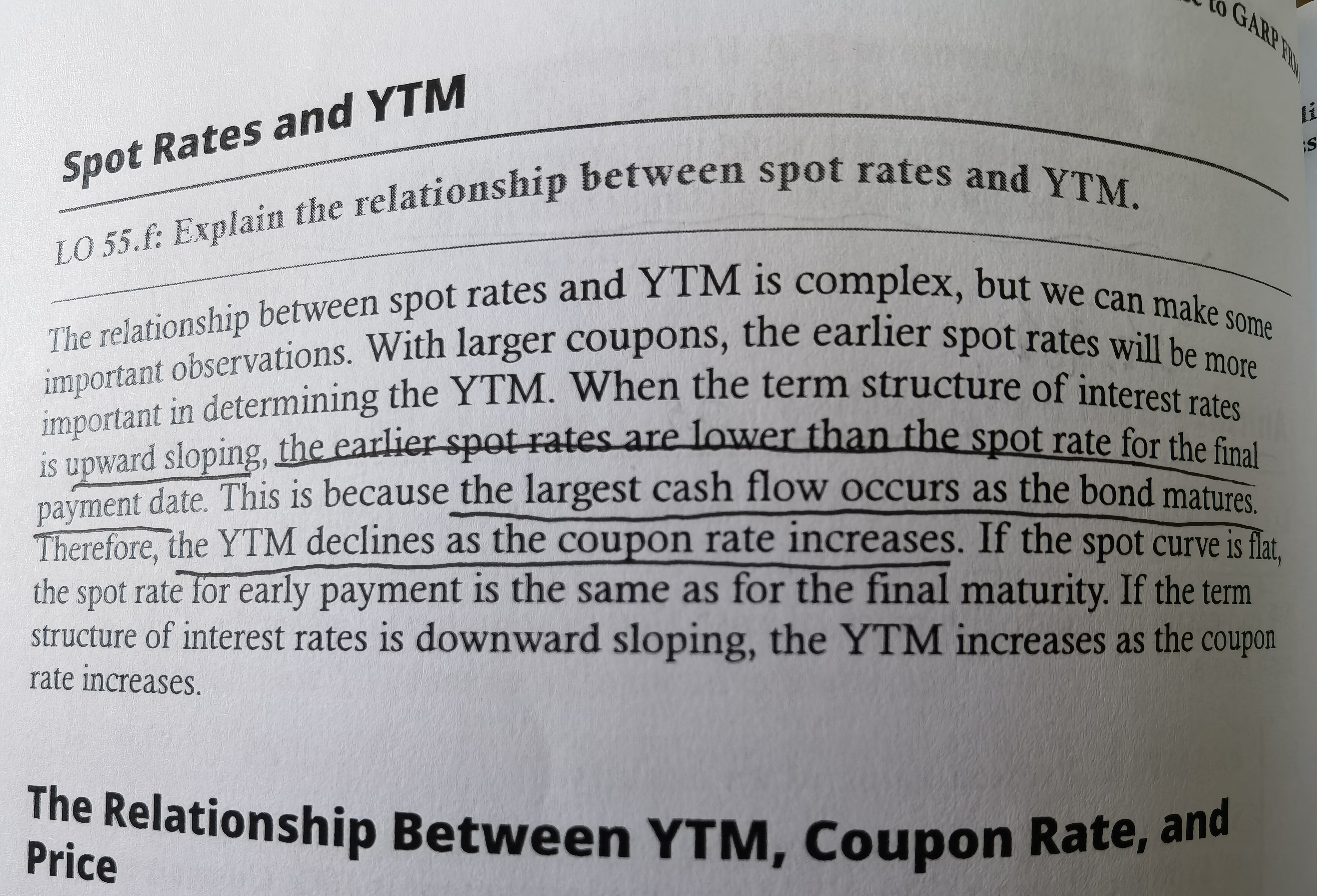 课程听了。得出的结论就是YTM接近于最后一期spot rate,这和我之前的理解一样。但是 coupon rate决定票息,票息不是固定的吗 票息越大,为什么YTM越小,YTM不是应该最接近于最后一期spot rate吗。这样的话,是不是变成spot rate和 coupon rate 的关系。怎么就很突然的coupon rate出来了