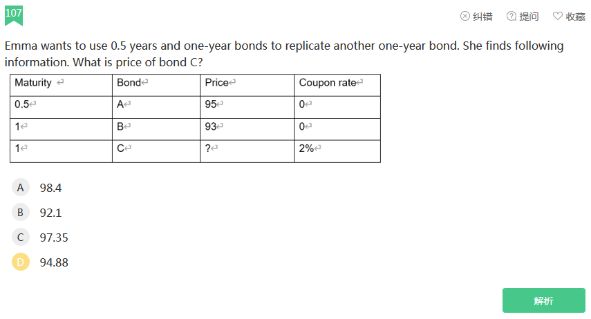 同学,这个题目考察的是债券的复制哈,为了达到跟目标债券现金流一致的目的,就需要用已知债券的现金流来匹配,根据已知债券现金流的期限,可得在0.5时刻只有债券A100块钱本金的偿还,所以只有A债券能够满足C债券0.5时刻coupon的现金流复制,就可以列式了,以此类推,就可以得到在1时刻用A和B共同复制C的现金流,两个式子结合就得到A和B各自的权重,对价格加权就得到C的价格了哈