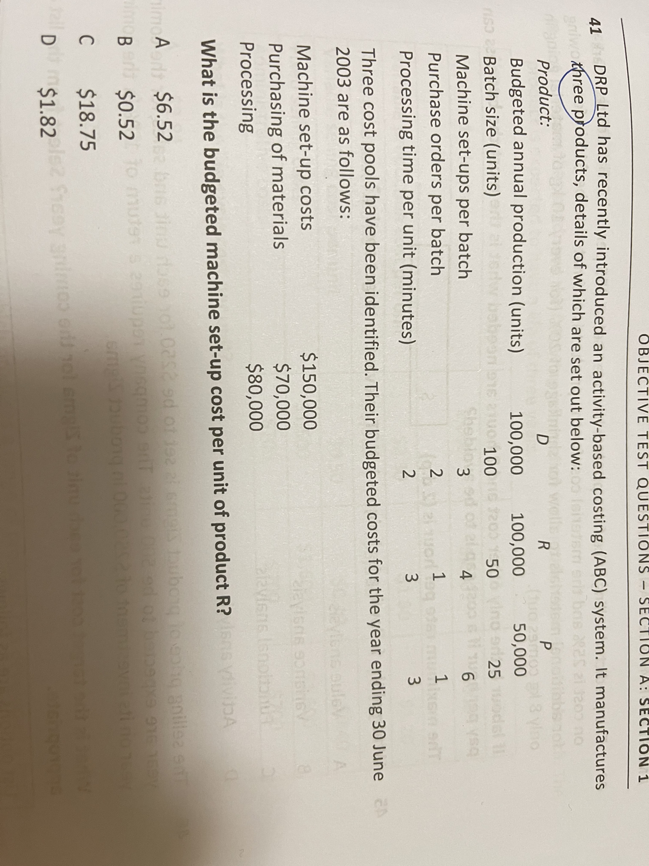 同学,该题目跟前面回复的33题类似。先需要算出每个产品总的set up数量,例如D:总的生产数量/每批次数量=有多少批次,再乘以每批次需要的set up数量得出总的D的set up数量。100000/100*3=3000,同理得出R 8000;P 12000。总共是23000。machine set up costs是150000,那么cost per set up=150000/23000=6.52。那么R就是的machine set up costs per unit=6.52*8000/100000=0.52。