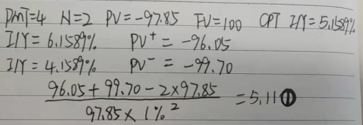 同学,如图所示,与modified duration类似,我们可以将modified凸度表示为:modified凸度=凸度/ (1 + y/m)2,我们可以计算出有效凸度再进行修正凸度的转化哈