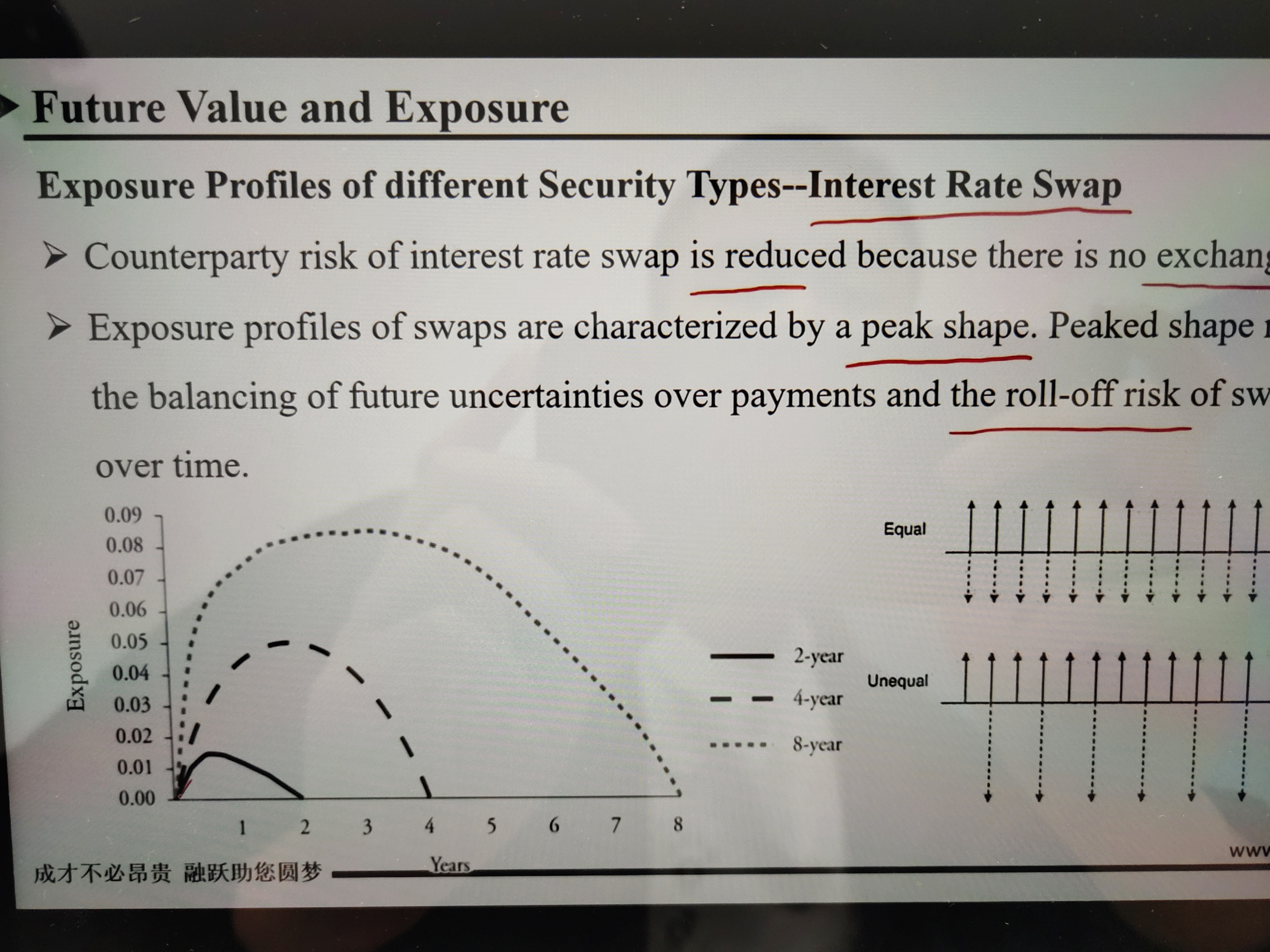 同学,因为虽然利率互换在未来的不确定性是高的,但是越到后面需要收回的就越少,越到后面,需要收回的部分就越少,要收回的现金流越小,所以敞口就越小,前期不确定性占主导,所以前期敞口是上升的,后期现金流减少占主导,因为到后期现金流的影响是越来越大了,所以后期敞口是下降的,整体就是先上升后下降的peak shape。峰值形状的产生是由于未来支付的不确定性和互换支付随时间推移要收回的金额降低两者叠加效果的影响哈