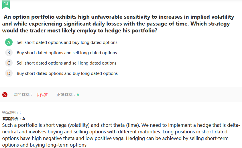 同学,当前的投资组合呈现出来的是负的vega和负的theta,为了对冲投资组合就要构造出能使投资组合中性的产品,根据各个希腊字母的特征和对时间的考虑,就可以判断出来A选项的构造可以产生较大的正的vega和theta,符合题意哈