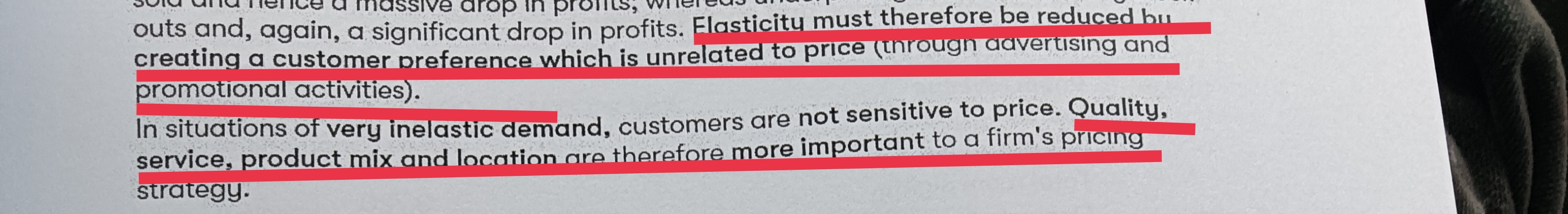 同学,意思是富有弹性时公司就要降低价格,从降低成本方面入手,比如看那些对客户来说不太创造价值的方面来降低,像广告费等等。无弹性时,公司制定价格就无所谓,那么提升质量,增加服务,进行产品组合等等怎么好卖出去怎么来。