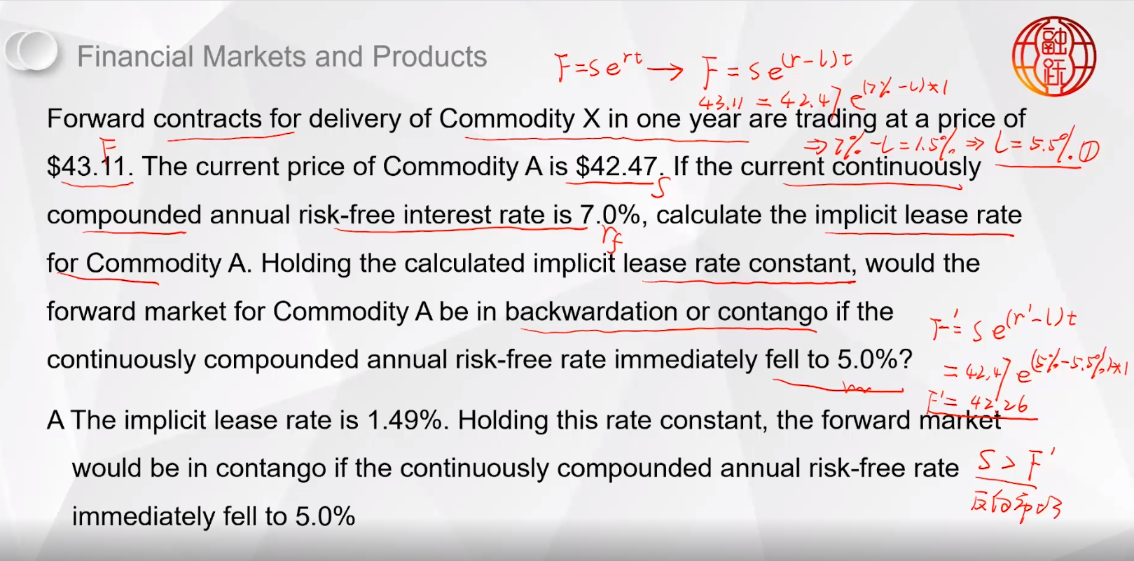 同学你好,这道题分两问,第一问是根据S、F、Rf带入期货定价公式计算出来隐含的lease rate。第二问,由于隐含的lease rate是一个常数,所以此时根据S、F、隐含的lease rate以及已经变化了的Rf带入期货定价公式,可以计算出F小于S,所以判断出是backwardation。具体计算方法参考图片理解