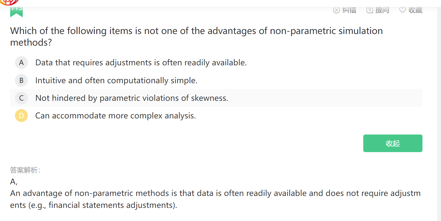 同学你好,非参数法数据不要求调整且可以直接得到,所以A错,A说的是要求调整的非参数法数据可以很容易得到。非参数法可以跟更加复杂的方法比如:加权历史模拟法(时间加权法、波动率加权法、相关性加权法、filtered 模拟法)进行结合,所以D选项说法是正确的的,题干让选的是不正确的选项。所以答案选A没错的。
