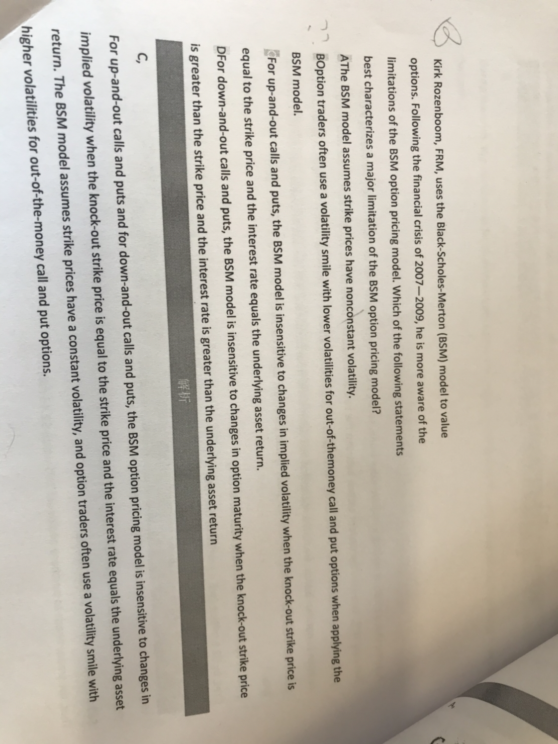 根据股票期权和外汇期权的不同波动率特征可知B选项错误,敲出期权在C选项所述阶段对波动率比较敏感正确。
