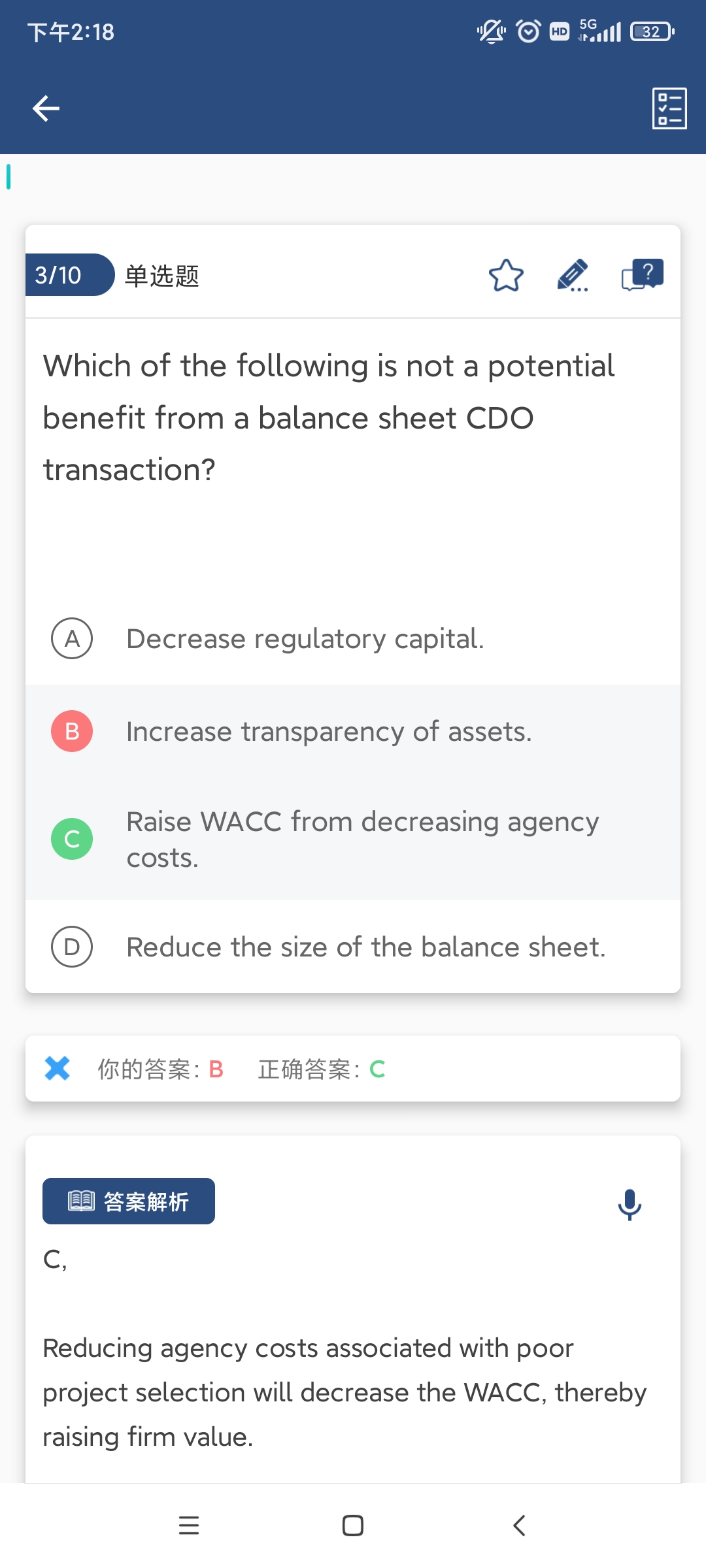 同学,CDO交易中出售标的资产的银行通常是大商业银行。因此,可以相对容易地获取有关它们的信息。优先债券投资者承担非常低的风险,只需分析一些市场总体的数据。次级债券投资者则需要具体分析CDO的风险、收益、法律条款,密切关注影响投资回报的各种因素,要对比着来看选项的描述哈