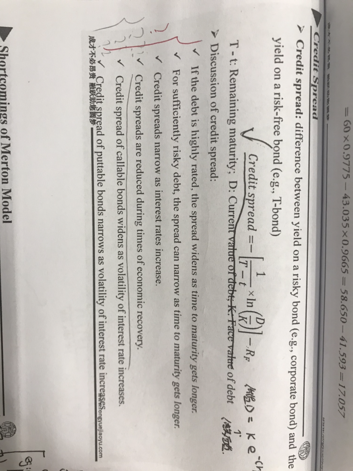 同学,前两句话意思是如果债务评级较高,利差会随着到期日的延长而扩大,对于风险足够大的债务,利差会随着到期日的延长而变小,当前评级高的债券,在未来违约概率逐渐累积的情况下,只要时间足够长,信用风险是逐渐增大的,对于当前信用质量差的债券,在近几年如果没有违约,那么后期违约的可能性就逐渐降低了;中间两句话意思是随着利率上升,信贷息差缩小,在经济复苏时期,信贷息差会缩小,表明的是当经济上行的时候信用利差是降低的;最后两句话意思是可赎回债券的信用利差随利率波动幅度增加而扩大,可回售债券的信用利差随利率波动幅度增加而降低,根据可赎回债券和可回售债券的产品特性,一类是相当于short call一类是相当于long put,就可以判断出来了哈