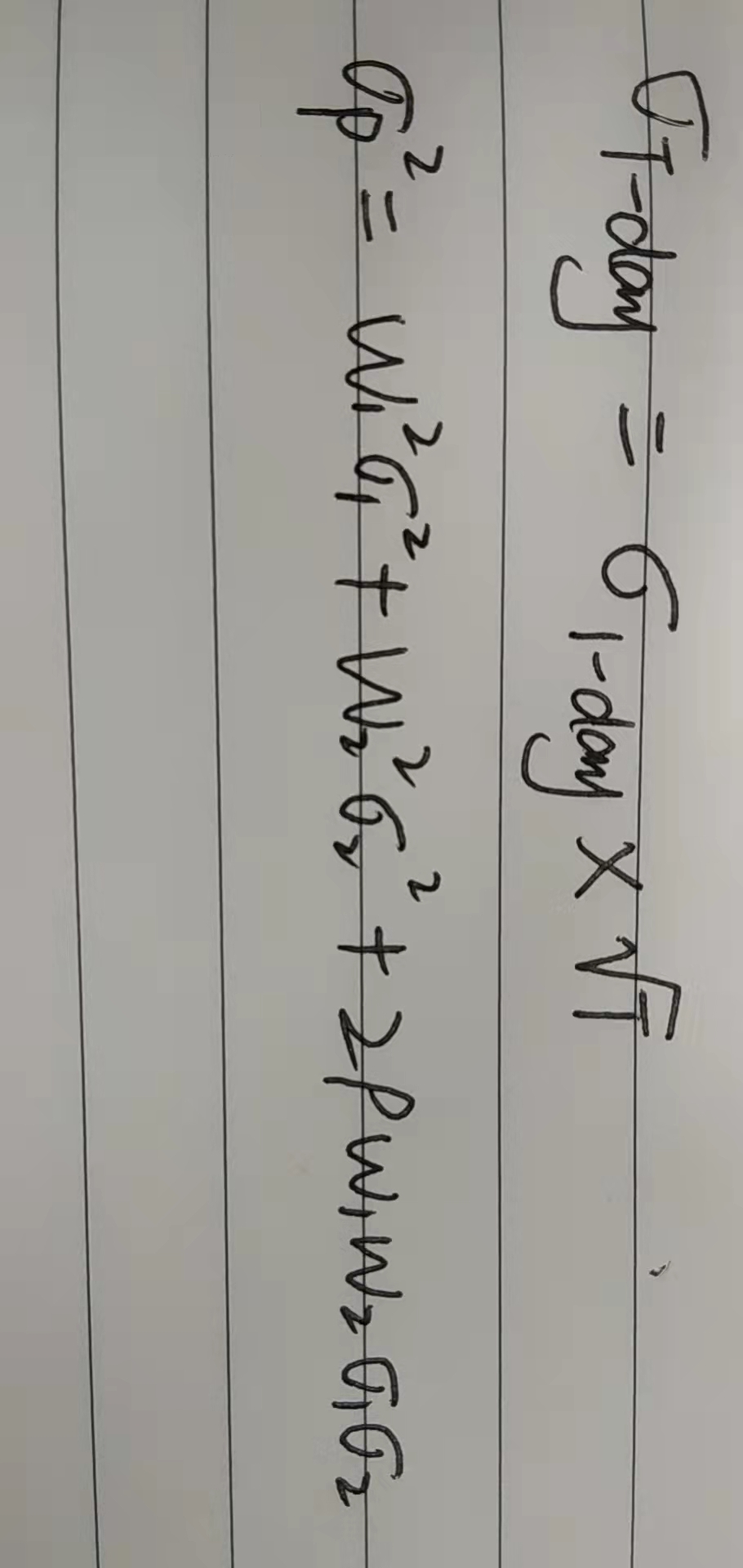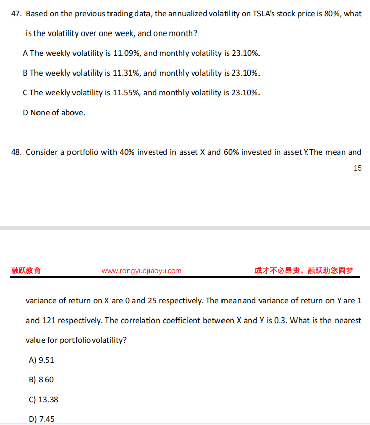 同学,第一题用的是时间的平方根法则,计算公式如图所示;第二题考察的是两资产投资组合的标准差公式,如图所示
