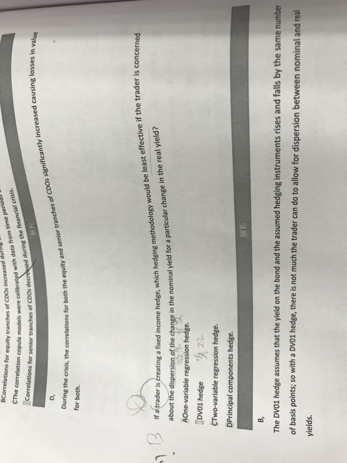 题干意思是如果一个交易员正在创建一个固定收益套期保值,如果他担心名义收益率的变化与实际收益率的特定变化之间的差异,那么哪种套期保值方法最不有效,DV01套期保值假设债券和套期工具的收益率涨跌相同数量的基点;因此,通过DV01对冲,交易员无法考虑到名义收益率和实际收益率之间的差异。