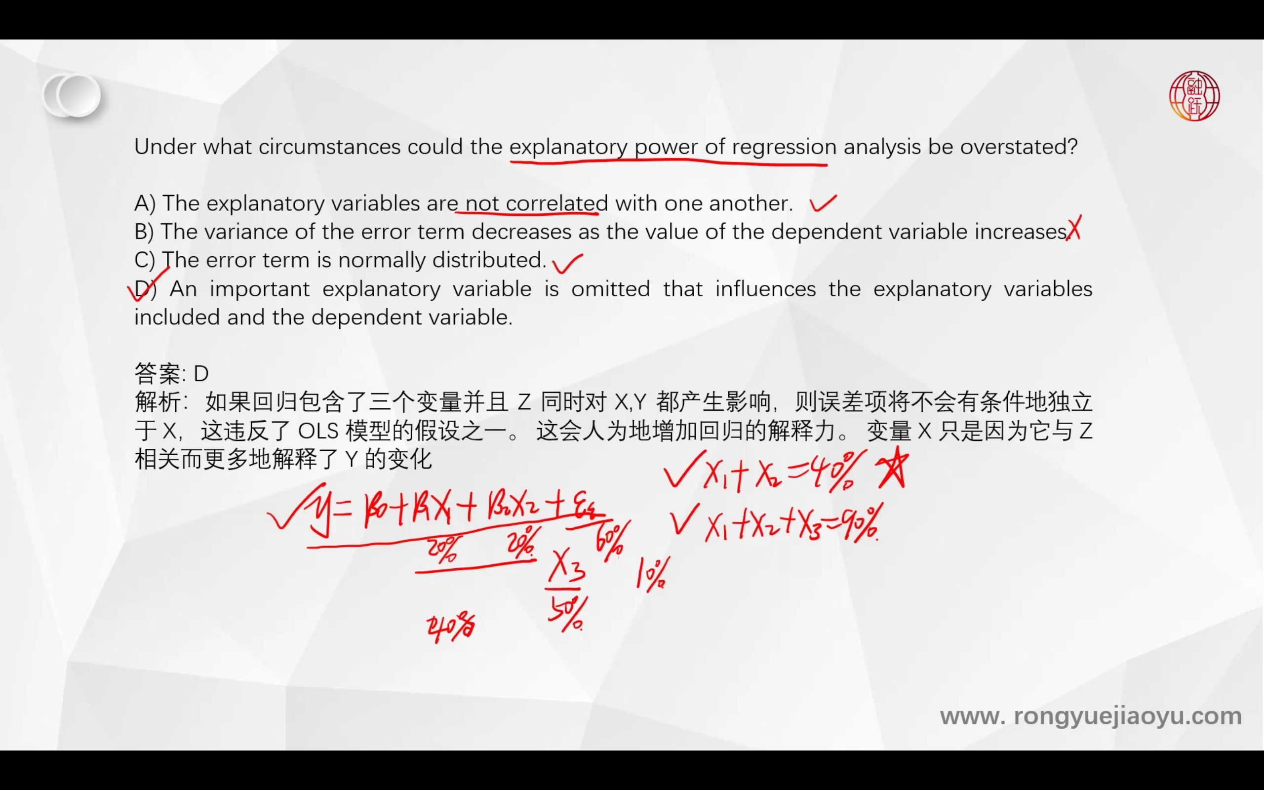 同学,B选项不符合线性回归的假设,不会使解释力度高估哈